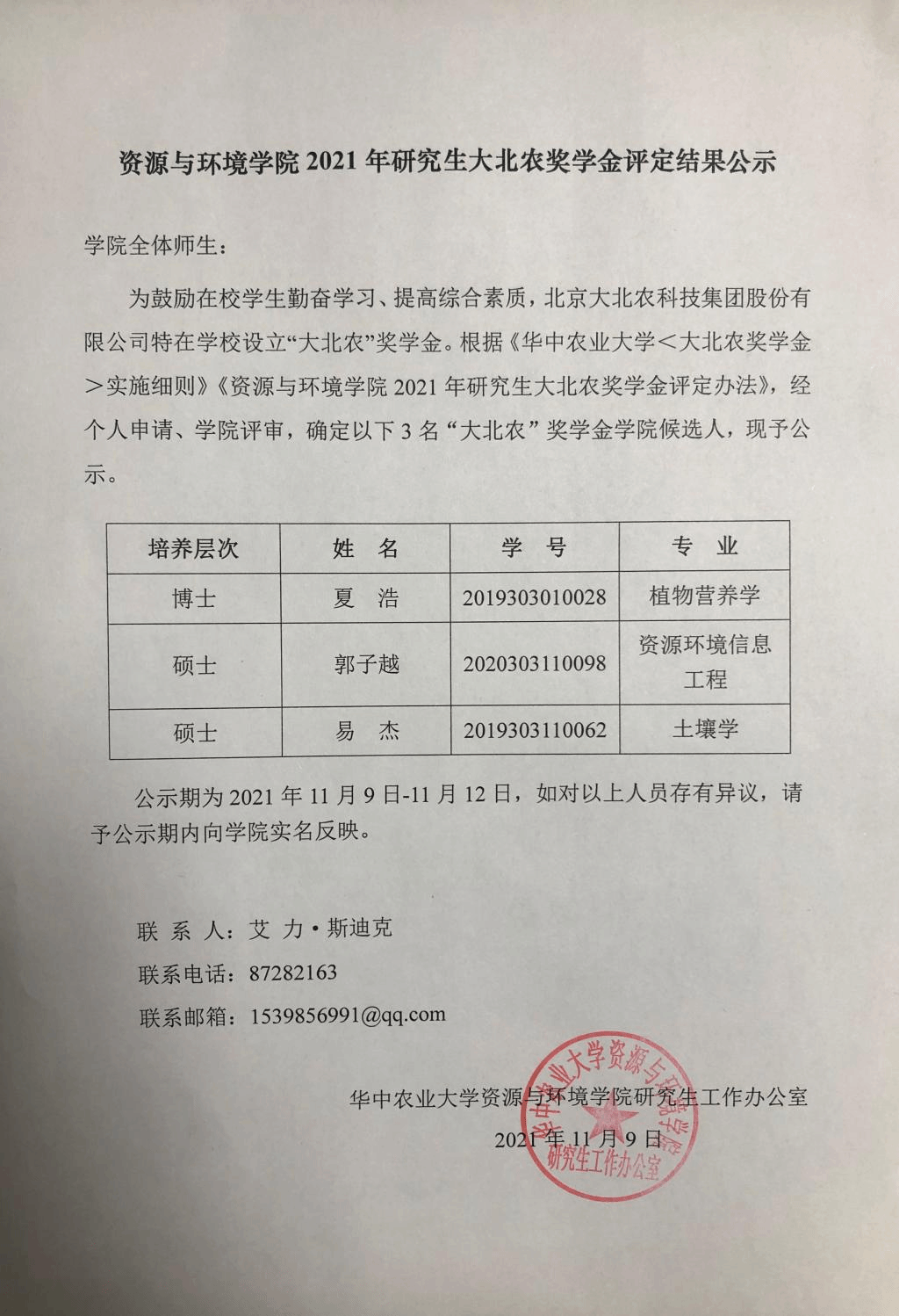 51黑料网 2021年研究生大北农奖学金评定结果公示