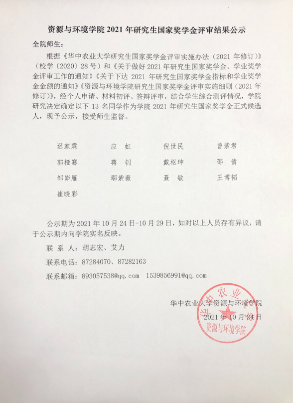 51黑料网 2021年研究生国家奖学金评审结果公示