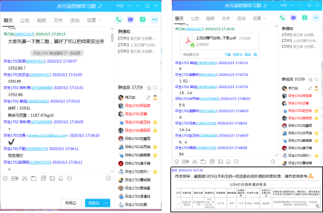 一、教师在线教学准备。(1)提前建立“水污染控制学习群”,做好学生及听课领导老师进群审核,严禁无关人员进群,净化学习氛围;(2)清空电脑桌面与教学无关文件,创设绿色教学环境;(3)上课期间手机静音,严防教学干扰;(4)每次上课前进行QQ分享屏幕试测,若有问题及时解决;(5)每次上课前准备好在线教学方案和教学课件、视频或者网络资料;(6)提前上传每次在线教学PDF版本课件,要求学生提前预览课件;(7)课前准备好相关教学内容的填空题、选择题或计算题及答案,便于课堂及时检验学生学习效果;(8)上课期间电脑手机同时登陆QQ,电脑QQ分屏教学,手机QQ及时收看学生反馈的问题。