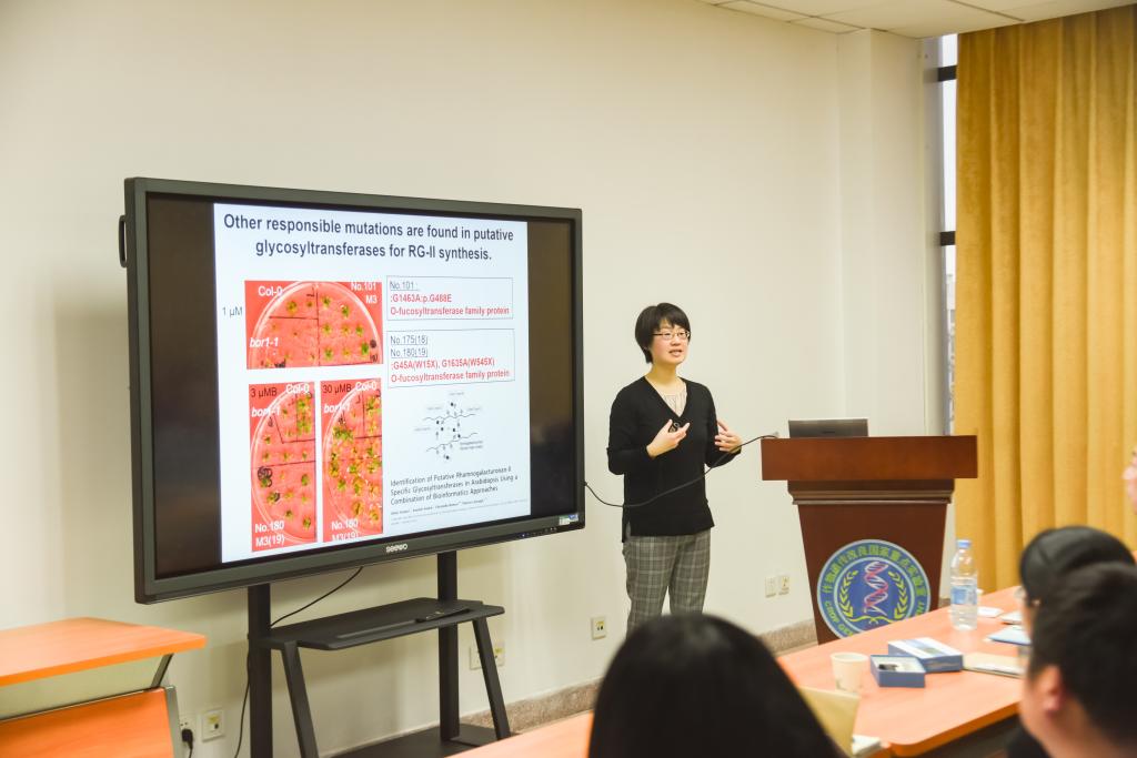 11月26日下午,Miwa教授在作物遗传改良国家重点实验室C407作了题为“Nutrient-dependent translational control and generation of B-efficient plants”的学术报告。报告就植物如何多维度响应营养元素的变化及如何挖掘植物自身降低对硼的需求潜力两个话题进行展开。她首先从植物缺硼的症状出发,介绍了硼在植物体中的营养功能、低硼胁迫下BOR1和硼中毒条件下BOR4的调控机制,强调了实现养分高效利用对可持续发展农业的重要性。随后针对课题组近年来的工作,她提出我们不仅需要关注营养元素转运蛋白在转录水平调控,也要关注转录后在翻译水平的调控。此外,以拟南芥bor1-1突变体为研究材料,EMS诱变筛选出与低硼需求紧密相关的功能基因,为低硼植物的创建提供了创新性的研究方法和实践基础。