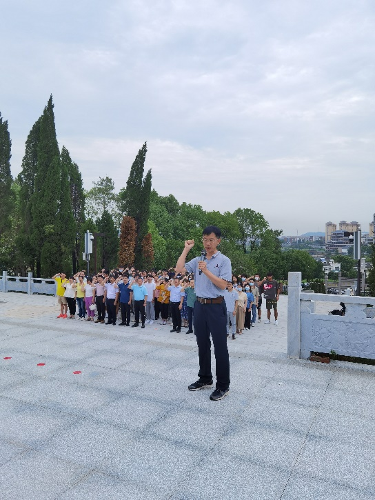 全体成员在烈士陵园革命烈士纪念碑前进行了哀悼仪式并敬献鲜花,然后集体唱响中华人民共和国国歌,最后职工党员和学生党员分别在纪念碑前举行了重温入党誓词活动。