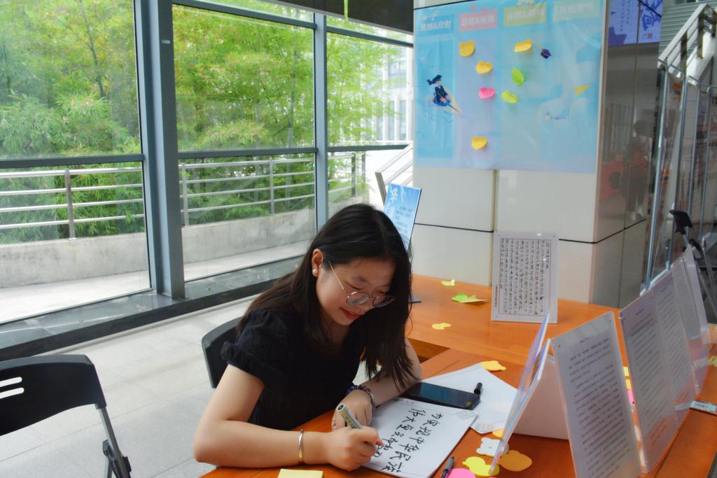 参观结束后,支部毕业生党员在图书馆大厅的毕业留言区写下自己的理想目标,支部党员宋莹燃写下“为实现中华民族伟大复兴而努力奋斗”,即将继续求学深造的她希望能够通过自己的专业学习为美丽中国建设贡献自己的青春力量。