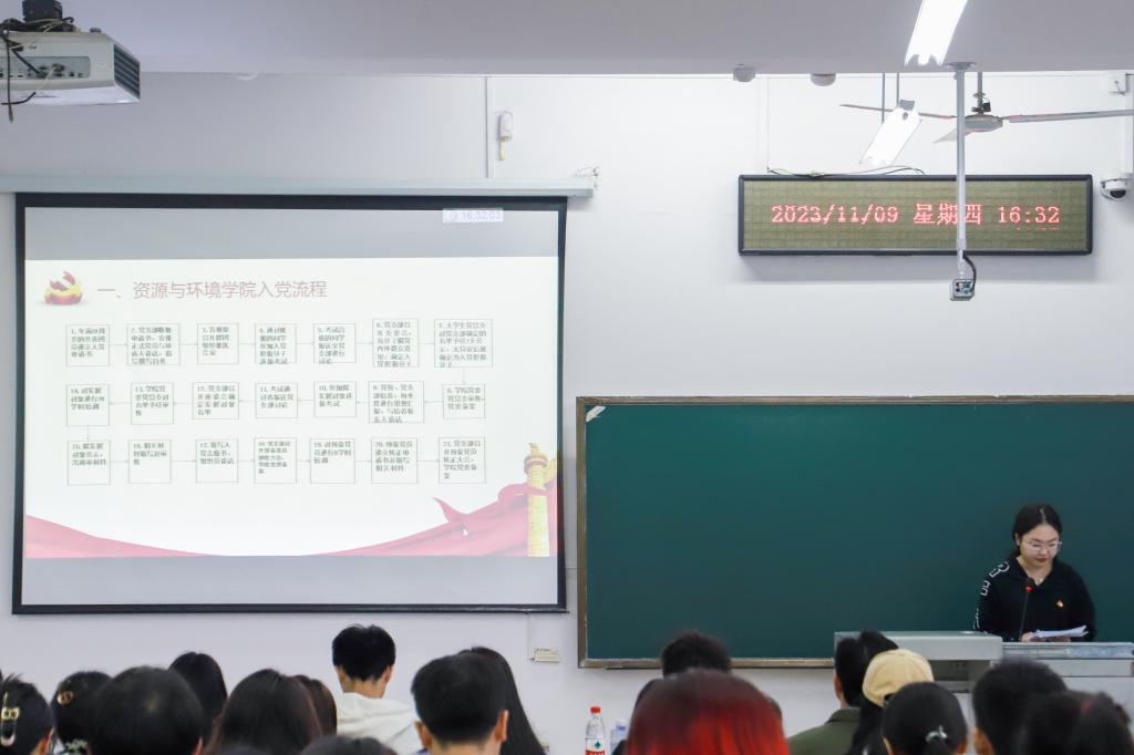 会议伊始,吴佳惠从入党流程、线上党校要求、党校特色活动等方面向学员们介绍党校的培训流程。随后,来自环生2202班的李紫燕同学向大家分享自己的党校学习心得。她谈到:“通过党校的系统学习,我明白了入党不是口号,是坚定信念、锤炼党性、追求信仰的过程。”“青年兴则国家兴,青年强则国家强”,本期学员代表环科2201班阮莉啦上台发言,她代表全体学员表示将认真学习党校课程,不断提升理论素养,通过党课的学习,努力做到全面发展自己,主动完善自己,逐步向党组织靠拢,把自己锻炼成符合党和人民期望的合格的新时代青年。