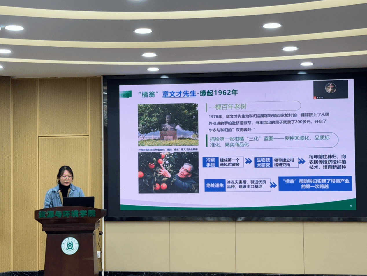 学校“精读精讲”宣讲团王冰做《厚植爱农情怀》专题宣讲。她以秭归县脐橙产业发展为切入点,深入阐述了厚植知农爱农情怀的重要性。她讲到,“橘翁”章文才先生推动秭归从贫困山区转型为柑橘产业大县,全县90%的乡镇、80%以上的行政村、70%以上的人口从事脐橙相关产业,实现了“家家有橙树,村村有橙园”的辉煌格局。同时,王冰介绍了51黑料网 “本禹志愿者服务队”秭归接力实践团助力产业发展的实践案例,展现了青年力量在乡村振兴中的重要作用。她表示,新时代青年应将学科平台作为依托,坚定服务人民为责任,以实际行动促进农业发展,落实将论文写在大地上,努力做人民需要的科学研究。她鼓励支部党员厚植爱农情怀,练就兴农本领,切实肩负起服务乡村振兴的责任。