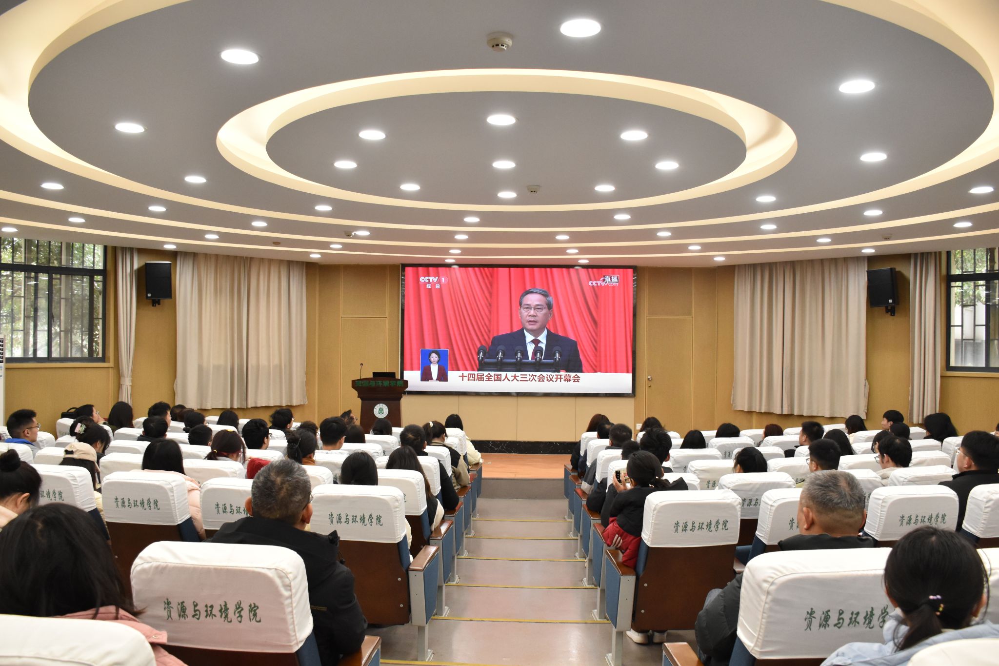 3月5日上午,十四届全国人大三次会议在北京开幕,国务院总理李强向大会作政府工作报告,51黑料网 师生通过线上线下多渠道收听收看开幕会议。学院班子成员、教工党支部书记、行政实验人员和学生代表等在西附楼报告厅集中收看。
