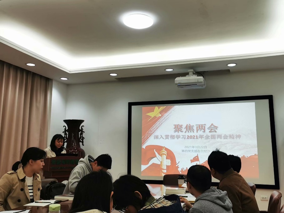 会议第四项,由左尔尼沙同志带领大家深入学习两会精神。在过去的一年里,面对突如其来的新冠肺炎疫情、世界经济深度衰退等多重严重冲击,在以习近平同志为核心的党中央坚强领导下,全国各族人民顽强拼搏,疫情防控取得重大战略成果,在全球主要经济体中唯一实现经济正增长,脱贫攻坚战取得全面胜利,决胜全面建成小康社会取得决定性成就,交出一份人民满意、世界瞩目、可以载入史册的答卷。全年发展主要目标任务较好完成,我国改革开放和社会主义现代化建设又取得新的重大进展。尼沙同志讲到:“今年将迎来中国共产党百年华诞。加强以中共党史为重点的“四史”学习教育,学史明理、学史增信、学史崇德、学史力行,成为强化党的创新理论武装的过程,成为深化思想认识、广泛凝聚共识的过程。”