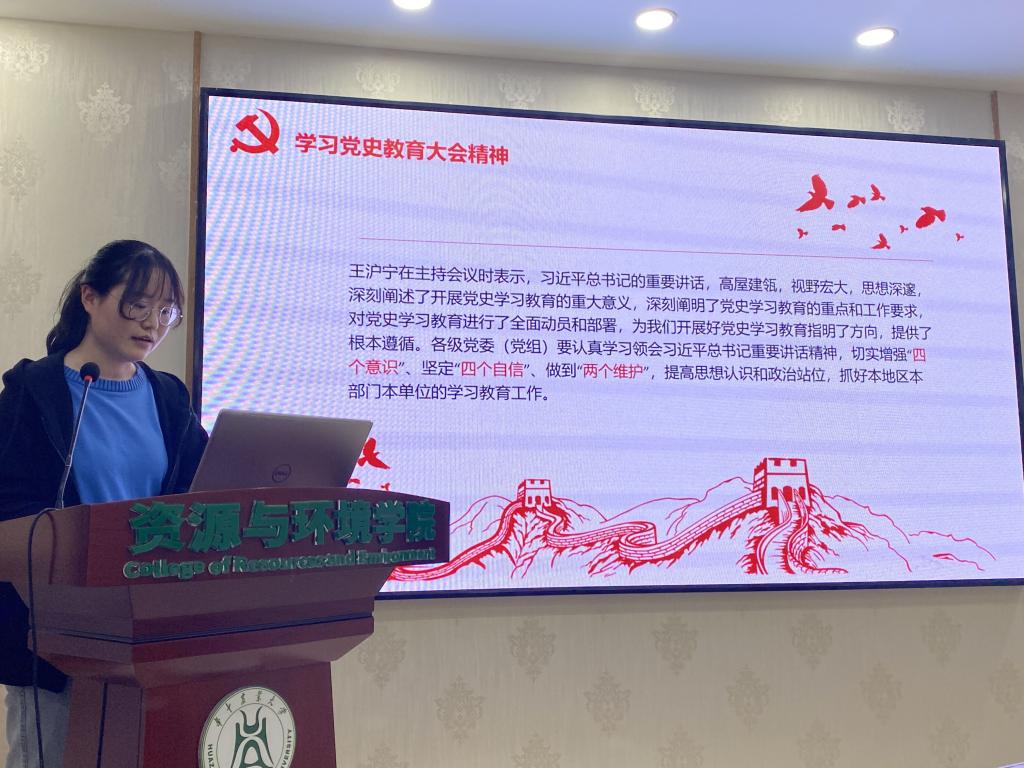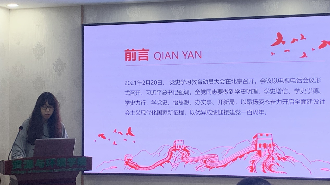 梅晴航同志首先带领大家共同学习了习近平总书记在党史学习教育动员大会上的重要讲话精神。让在场党员同志了解到习近平总书记对党史学习教育的几点强调,以及全党集中开展党史学习教育的必要性和开展党史学习教育的主要任务。宋欣雨谈到我们应知史爱党、知史爱国,认真学习党史,学史明理、学史增信、学史崇德、学史力行,在学懂弄通做实习近平新时代中国特色社会主义思想上持续下功夫。李路瑶谈到作为党员尤其是青年,我们更要牢记自己的初心和使命,坚定信仰和信念,积极学习党史,贯彻新时代党的创新理论和指导思想,无愧党员身份。海丽其谈到通过学习党的辉煌历史,她深刻感受到中国共产党一路走来一直想着人民,为人们谋利解忧,时刻牢记着为人民服务的宗旨。吴宇菡谈到“以史为镜,可以知兴替”,在中国共产党成立100周年之际,作为一名中国共产党党员,理应认真学习党史,领悟思想精神,体会我党光辉历程,在两个“一百年”奋斗目标的历史交汇点上,充分发挥自身思想和行为上的主动性,勇担中华民族伟大复兴之重任。陈芸洲谈到习总书记的讲话不仅强调了学习党史的意义,更指明了我们应该如何加强对党史的学习,作为党员我们更应该做到知史爱党,知史爱国,树立大历史观,把党的成功经验传承好、发扬好。