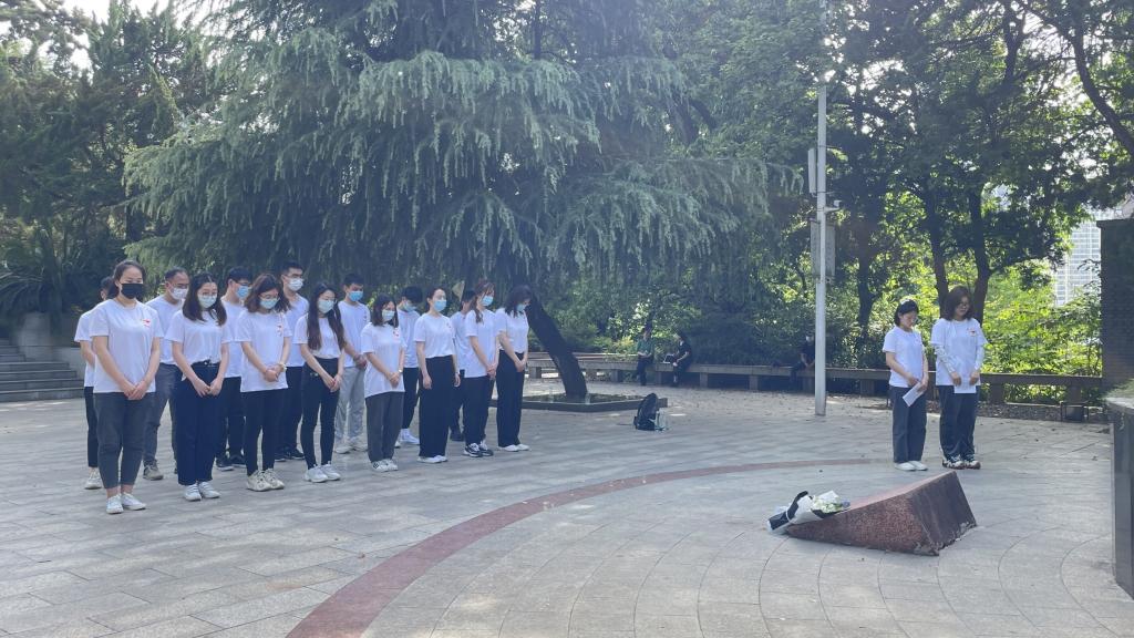 随后,大家一同前往施洋烈士陵园,瞻仰缅怀革命先烈,学习了解革命历史。施洋烈士陵园主要由施洋烈士塑像、纪念二七惨案的27级台阶、纪念碑和施洋墓组成,为纪念因京汉铁路大罢工而光荣牺牲的律师施洋而修建。在施洋墓前,学员蔡青青、孙雨欣讲述时代背景及施洋烈士生平,学员代表张紫荆为烈士鲜花,全体学员绕墓一周寄托哀思并在墓前肃穆默哀。默哀结束后,胡志宏分享了约翰·亚当斯的名言:我必须研究政治和战争,这样我的儿子们才会拥有研究数学和哲学、地理、博物、造船、航海、商业和农业的自由,他们的孩子才能拥有研究绘画、诗歌、音乐、建筑、雕塑、织艺和陶瓷的权利。他说,这段话直接而清晰的讲明一代人有一代人的担当、一代人有一代人的使命这个道理,以施洋烈士为代表的前辈们完成了他们的使命,历史的接力棒不可更改的交到了我们手中,希望此次主题团日能淬炼大家请党放心、强国有我的豪情与担当。