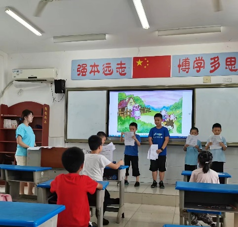 当然,小朋友们的性格是多彩缤纷的,除了大多数的积极踊跃之外,还是有几位小朋友不太敢于融入剧本的选择以及表演中,他们安静地坐在自己的座位上,静静望着讲台前的“热闹”场面。我们自然看出了他们眼中的期待与胆怯,安排组员主动去与小朋友面对面交流,带着剧本温柔地询问每一位小朋友内心的想法,并鼓励他们带着自己心仪的剧本加入其他小朋友的排练之中。当我们看到所有小朋友们都能够站在讲台上面对着大家念出自己的台词,甚至随着角色情绪的变化调整语音音调,并加上丰富的肢体动作,台下作为“观众”的我们不仅有被逗乐的忍俊不禁,非常真诚的热烈掌声,还有内心里对孩子们丰富的想象力与创造力的感叹,以及得到了收获的满足。