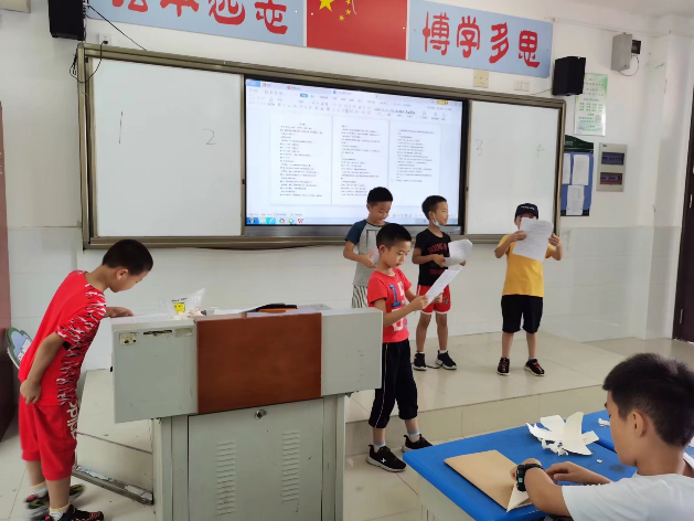 7月7日和8日,我们以“艺术”为一大主题,为1班和2班的小朋友们讲授了“戏剧表演”和“动画漫谈”两个课程。由于这两个班级里都是一二年级的学生,我们便在备课中着重展现了表演部分。我们精心准备了小朋友们熟知的《三只小猪》、《小红帽》等童话故事以及《熊出没》、《海绵宝宝》和《猫和老鼠》等动画片的剧本供大家选择并表演展示。大多数小朋友对表演展现出了极大的兴趣,都争先恐后地选择自己喜欢的剧本,不需要老师组织安排便自己分好了角色、对起了台词并找出一些“道具”,让我们惊叹这竟然是还处于顽皮捣蛋阶段的一二年级的孩子。