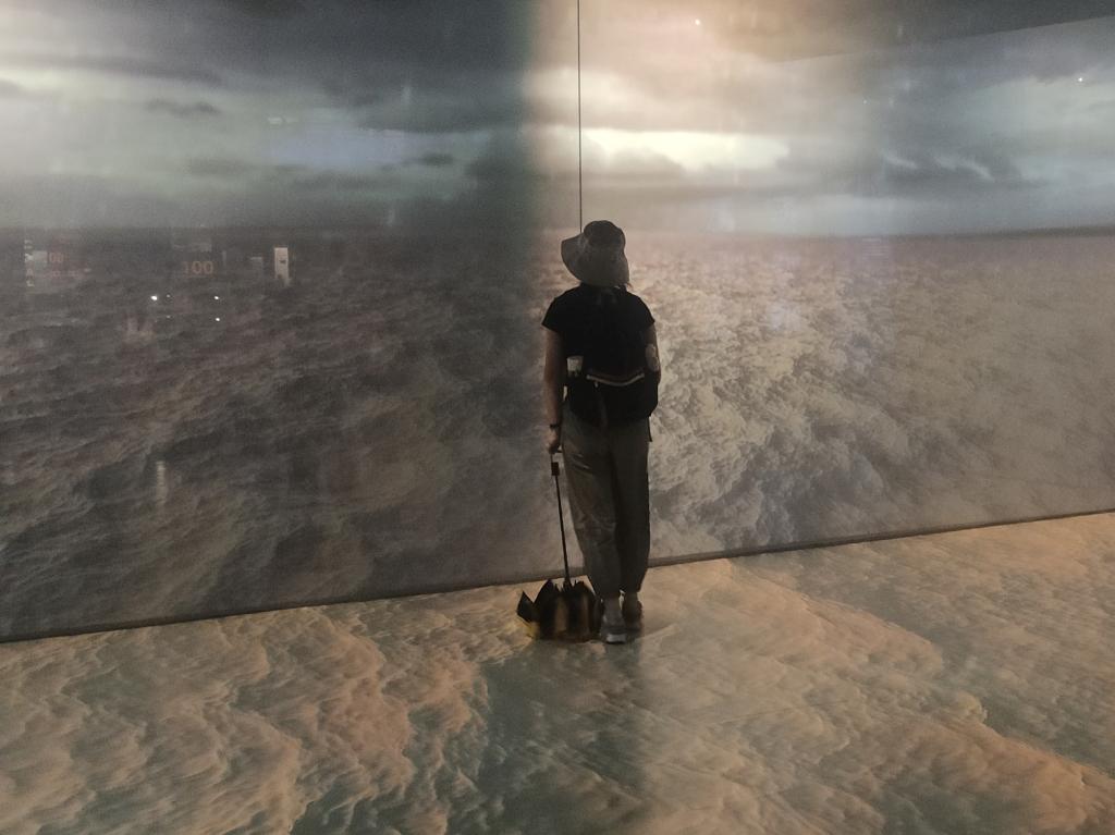 小组成员首先来到九江九八抗洪展陈馆开展了本次研学之旅。1998年,长江九江大堤决口,直逼城区,威胁着40多万九江人民的生命财产安全。按照党中央要求,抗洪部队紧急驰援九江,数十万解放军官兵用自己的血肉之躯,构筑起长江大堤上的钢铁长城,创造了抗洪史上的人间奇迹。九江九八抗洪展陈馆共设置了三个展厅,分别展现了灾前、灾中与灾后的九江,展现了全国人民勠力同心、搏风击浪的情景,使实践团成员切实地感受到当时洪灾的危急。小组成员阮益竹在看过展厅里搭建的裸眼3D洪水景象后心情久久不能平息,她说:“知道这都是假的却还能感到害怕,足以证明当时的奋战在抗洪抢险一线的武警官兵是多么勇敢无畏,以身躯守护着一方山河。”