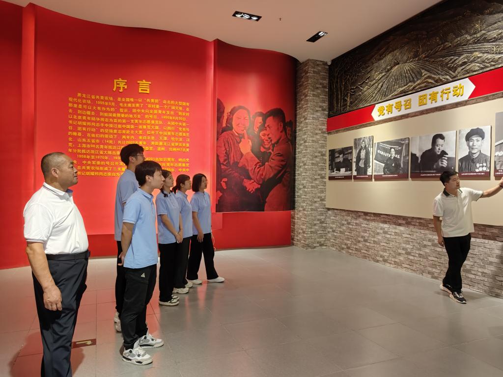 纪念馆内,一件件垦荒物件、一张张留存照片、一幅幅真实场景,展现出一代代青年志愿垦荒队员艰苦卓绝的毅力和坚定不移的信念,诉说着那段气壮山河的历史。“1955年5月,毛主席发表了‘农村是一个广阔天地,在那里是可以大有作为的’指示,团中央向全国青年发出‘到农村去,到边疆去,到祖国最需要的地方去’的号召。1955年8月30日,以北京青年杨华同志为首的第一支青年志愿垦荒队,从团中央第一书记胡耀邦同志手中接过新中国第一面垦荒大旗,以践行‘党有号召、团有行动’的坚强意志,奔赴北大荒——萝北县境内,拉开了中国青年志愿垦荒的帷幕。在他们的带动下,两年内,来自北京、天津、哈尔滨、河北、山东5省市14批共计2602名青年,奔赴黑龙江省萝北县垦荒;上海市98名青年抵达江西省鄱阳湖畔垦荒;温州、台州467名青年分批抵达浙江省大陈岛垦荒”,讲解员张东升带领大家回顾历史脉络,石俊林则介绍展品背后的生动故事,互为补充更好展现垦荒历史。团队成员曾晨威说:“踏上这片土地,看到上千名年轻的垦荒队员毅然选择开垦荒地,我更加深刻地理解了‘信念坚定、艰苦奋斗、团结友爱、无私奉献’的中国青年志愿垦荒精神内涵。这也让我明白,无论时代如何变迁,垦荒精神都是我们青年一代应该继承和发扬的宝贵财富。”
