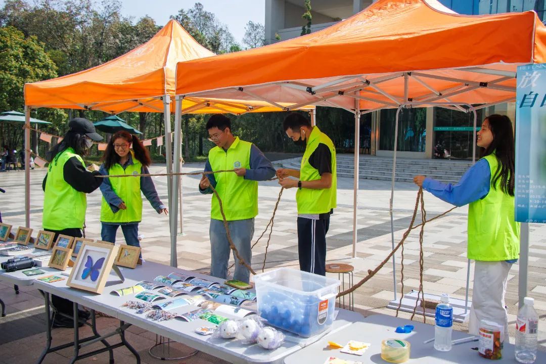 当天早晨,工作人员提前将桌椅排列整齐,并有序摆放好各类鸟类照片。相框中红隼、知更鸟、喜鹊等鸟儿呈现出灵动的身影,吸引着过往师生和游客的目光。观鸟护鸟小组部长王瑞思现场为大家讲解如何区分不同种类的鸟,以及雌雄个体间的差异,她还向众人介绍了一幅的大蓝闪蝶标本,让大家对生物多样性有了更直观的认识。
