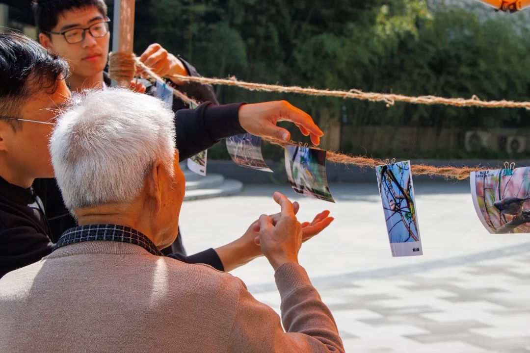 值得一提的是,在本次线下活动之前,绿色协会还开展了线上鸟类打卡小挑战。参与者需在华农校园内拍摄鸟类照片,附上日期水印并上传至指定平台,投稿次数达五次及以上即可完成挑战。这些投稿照片在活动当日进行了线下展览,活动现场的帐篷设置了三面照片墙,投稿者不仅能领回自己的照片,还能获得打卡奖品。了解到一位爷爷家中养了不少鸟儿,工作人员热情地引导爷爷参观照片展示区,随后挑选出契合爷爷喜好的照片和贴纸相赠,并贴心地在贴纸背后写下鸟名方便回忆。