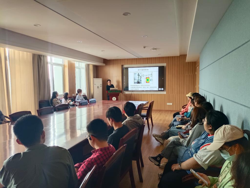 迟家霖首先向我们介绍了原子力显微镜的诞生历史,并详细为我们讲解了其基本原理和功能。他说:原子力显微镜可以进行样品表面的形貌表征(表面动力学研究)、物理化学属性的表征(压弹性、硬度和表面电势等)和单分子力谱的测定。
