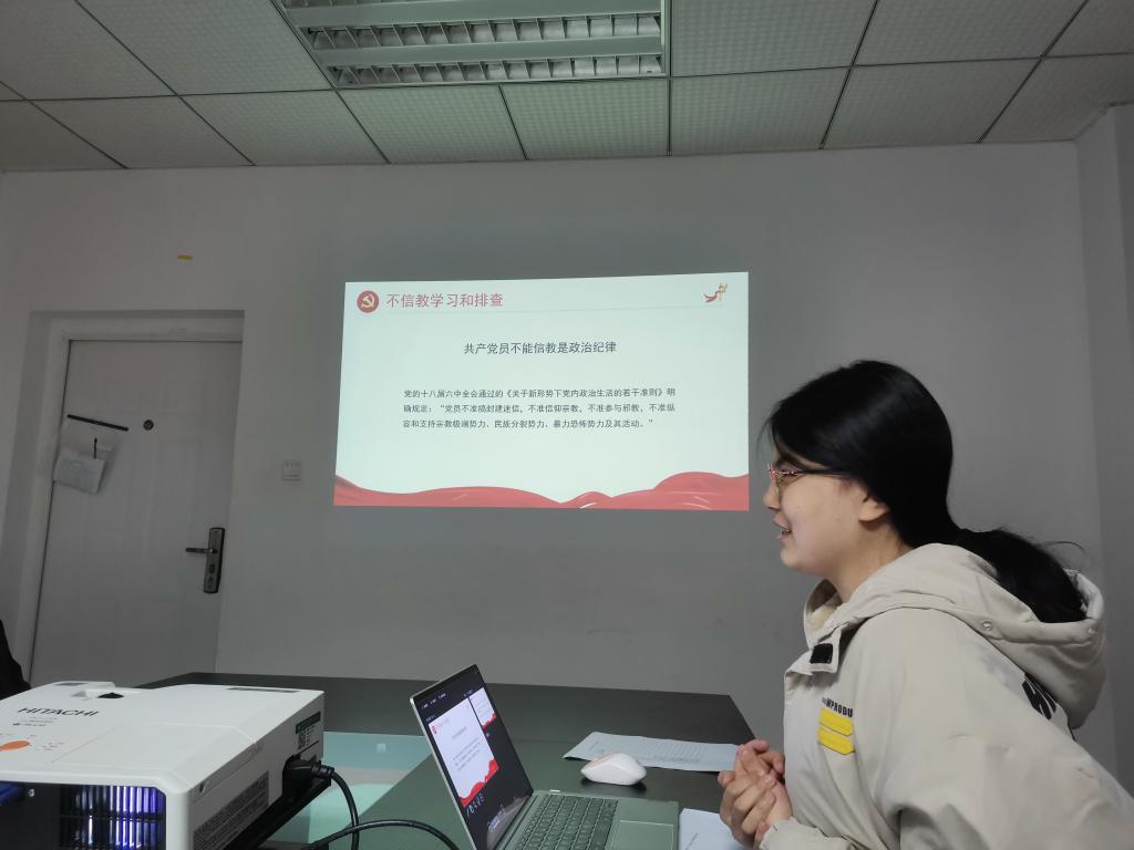 随后,陈雅渊带领大家学习2022年全国两会精神,同时开展党员不得信教学习教育。