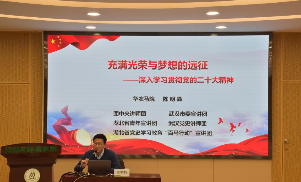 学校学习贯彻党的二十大精神“精读精讲”宣讲团成员、马克思主义学院副教授陈明辉以充满光荣与梦想的远征——深入学习贯彻党的二十大精神为题,从党的二十大概述、党的二十大报告概述、党的二十大精神学习建议、党的二十大精神学习重点——五个牢牢把握等四个部分解读党的二十大精神。他就党的二十大的背景、主题、成果等进行了简要阐述,对党的二十大报告的内容框架、主要内容、重要地位以及学习党的二十大的视角与方法进行了深入解读和分享。他重点围绕“牢牢把握团结奋斗的时代要求”进行讲解,以党的百年奋斗中建立最广泛的抗日民族统一战线、抗美援朝战争以弱胜强等实例诠释团结奋斗才能立于不败之地,以大庆石油“铁人”王进喜、红旗渠青年突击队、校友廖国瑞等青春奉献的故事勉励同学们挺膺担当、踔厉笃行。