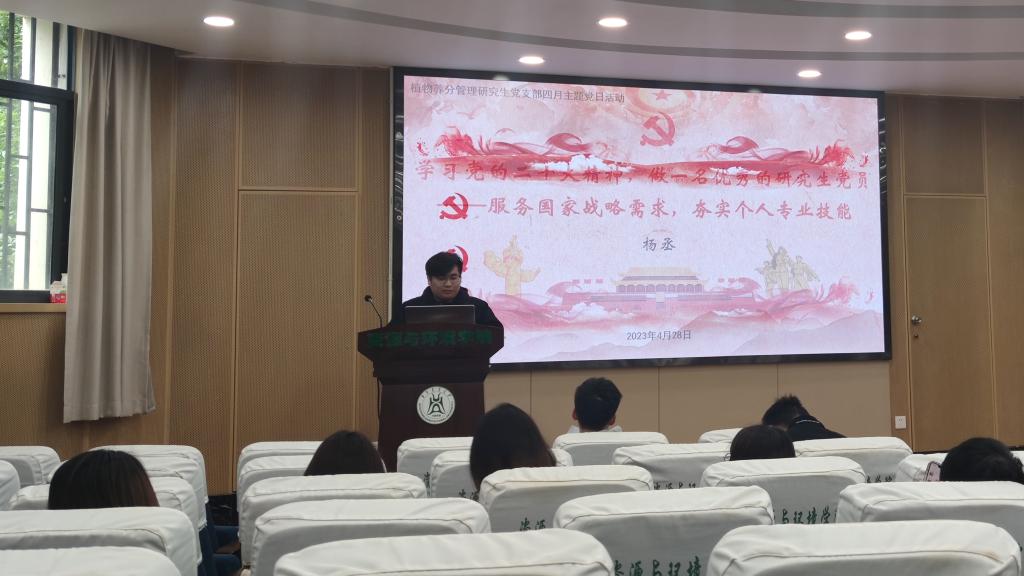 (通讯员:何紫瑶)4月28日上午,学院植物养分管理研究生党支部在西附楼报告厅开展4月主题党日活动,支部指导教师李小坤教授以“学习党的二十大精神,做一名优秀的研究生党员”为主题,为支部研究生党员讲授专题党课。