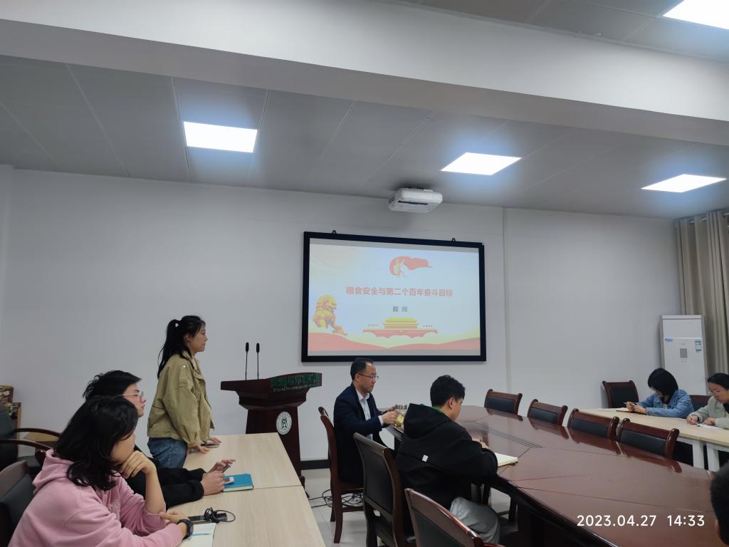 会议伊始,戴珂老师领学《粮食安全与第二个百年奋斗目标》内容。他首先介绍了我国粮食安全现状,由此强调我们粮食安全与耕地保护问题不容忽视,戴珂表示:“从粮食安全的数量与食品安全的质量上来看,我国粮食安全的主要问题是粮足食不足”。围绕华农人、土壤人的应尽之责,戴珂勉励大家立大志、明大德、成大才、担大任,努力成为堪当民族复兴重任的时代新人,发挥自己的专业本领,为确保粮食安全与实现第二个百年奋斗目标贡献力量。