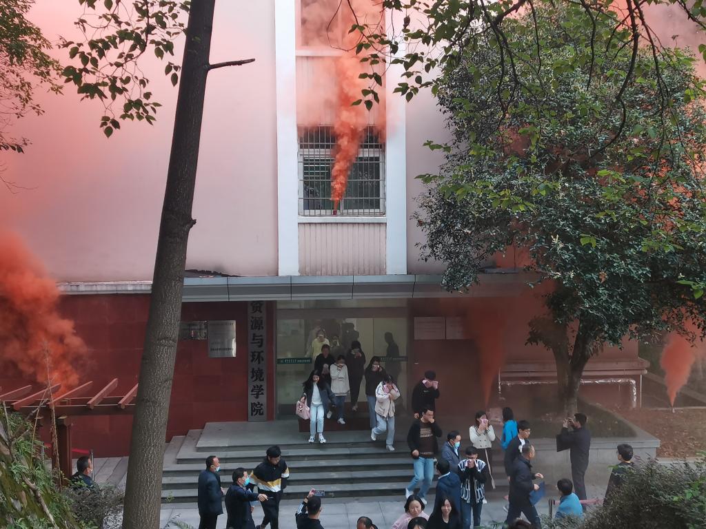 16时50分许,资环楼内浓烟四起、警铃大作,模拟火灾发生实景,资环楼“着火了”!楼内师生低头弯腰、用湿毛巾捂住口鼻,按照事先规划疏散路线从资环楼西门、北门有序撤离至主楼前台阶。随后,校园建设与安全保卫部工作人员在主楼前进行灭火器使用讲解培训,在场师生根据指引进行灭火器灭火实操演练。