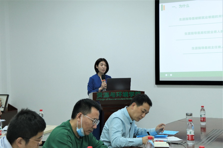 首先,张俊芳作“大学生心理危机识别与干预”主题报告。她从大学生产生心理问题的原因出发,逐一讲解学业、家庭、人际关系等常见诱因,她希望老师关注学生在言语行为等方面的反常现象,及时交流问询,理解、支持、引导学生调节心理问题。任丹在指导学生进行生涯规划方面提出了建议,她围绕“为什么”“是什么”“怎么做”三个话题,分析由社会、家庭、学校等外部因素和学生自身兴趣、价值、能力等内部因素造成的双向职业需求变化。强调高校人才培养的出发点和落脚点在于使学生具备服务社会主义建设的能力。梳理了大学生各阶段的不同生涯规划重点。