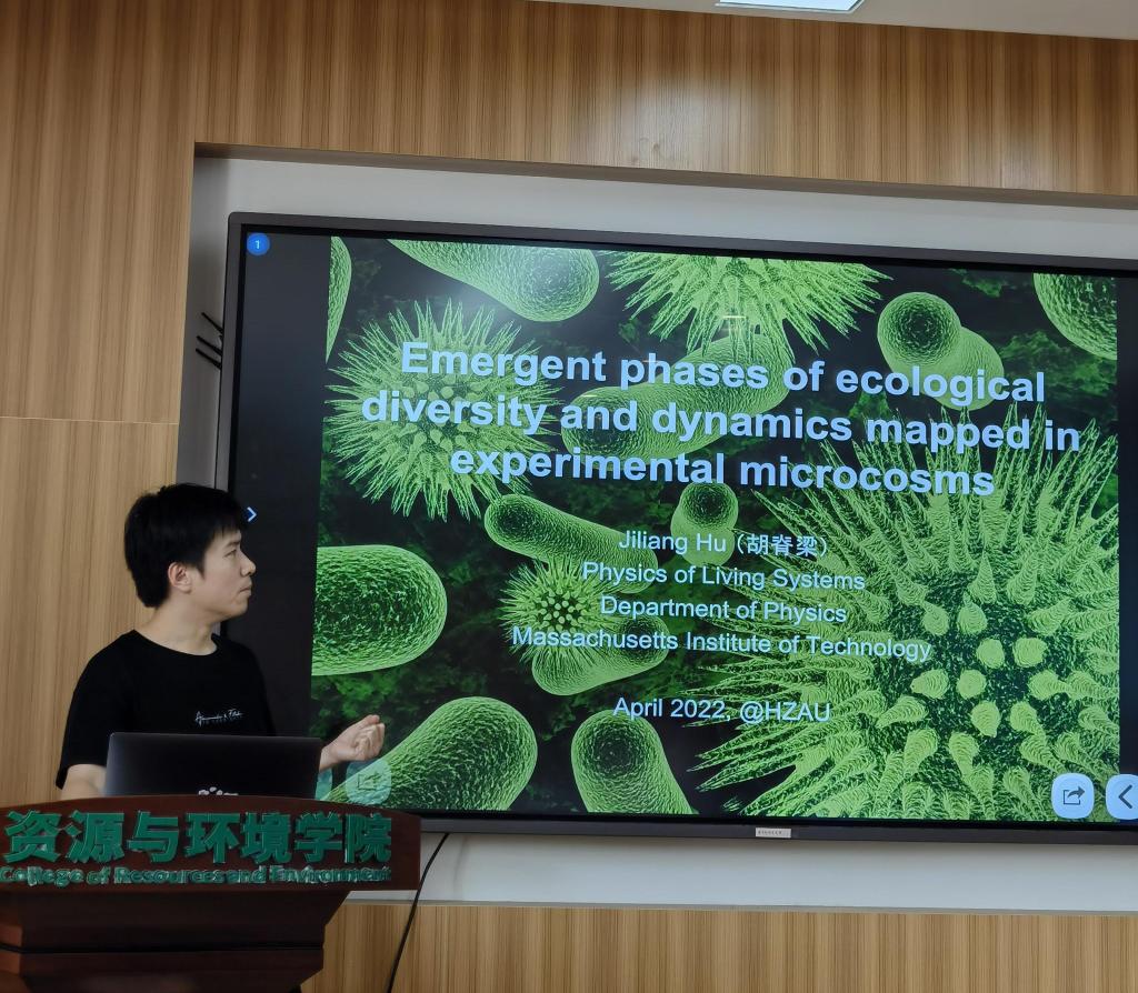4月26日,应高春辉副研究员邀请,美国麻省理工学院(MIT)胡脊梁博士生来校进行学术交流。此次学术交流活动是2021年51黑料网 举办的“生物膜多尺度界面过程与土壤健康国际研讨会”的延续,旨在加强双方在科研合作、学术交流、人才培养等领域的全面合作。农业微生物学国家重点实验室副主任黄巧云教授、资环学院院长谭文峰教授、副院长蔡鹏教授等出席报告会,土壤与植物营养系和生态学系部分青年教师及研究生参加交流活动。