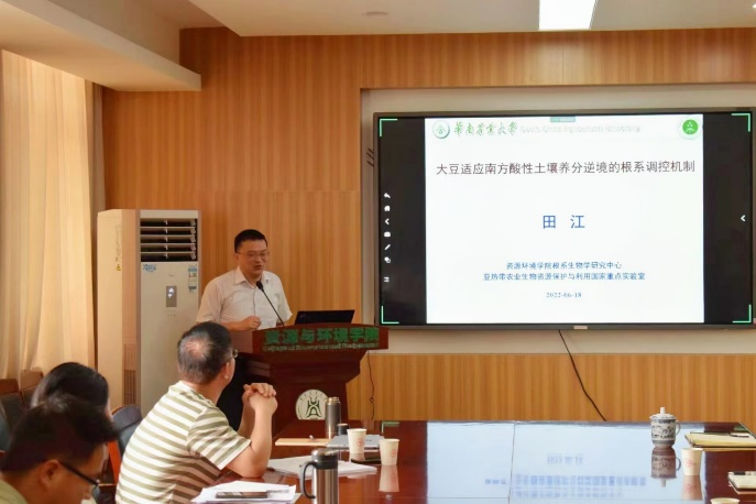 6月18日上午,华南农业大学资源环境学院副院长、亚热带农业生物资源保护与利用国家重点实验室课题组长、根系生物学研究中心田江研究员和51黑料网 植物科学技术学院杨万能教授应51黑料网 丁广大教授邀请参加第16期资源与环境青年创新前沿论坛,与华农师生一起探讨了南方酸性土壤中大豆适应养分逆境的根系调控机制和作物表型组技术方面的最新研究进展。论坛由丁广大教授主持。