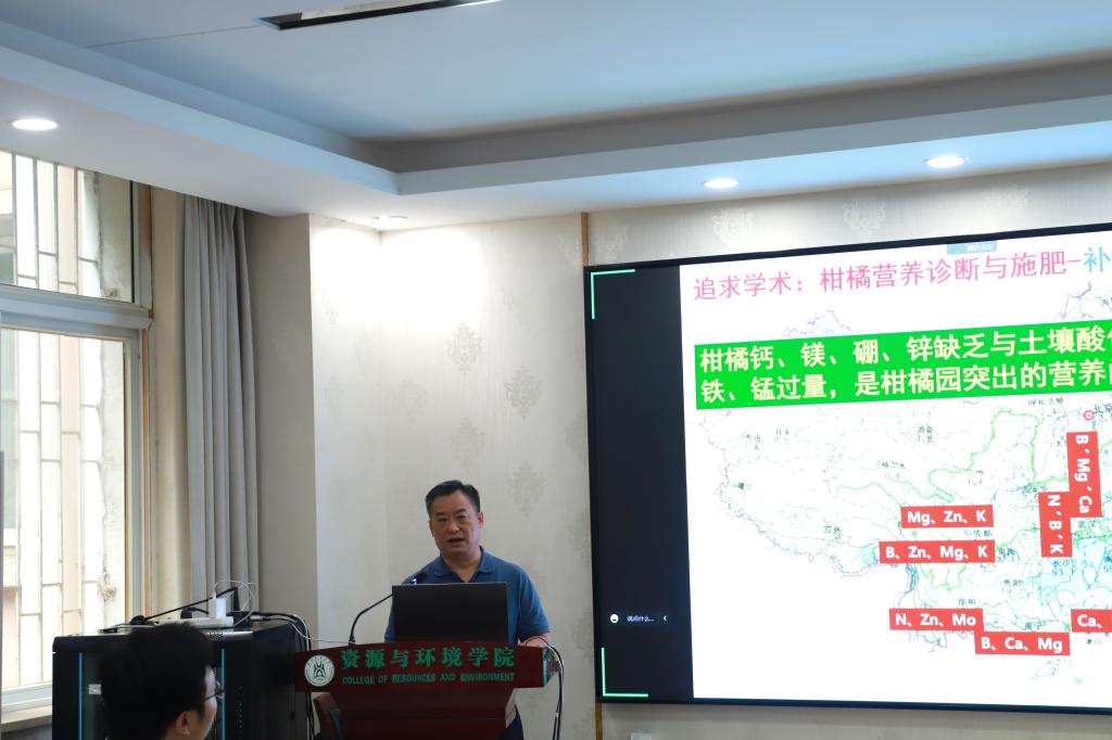 胡承孝教授以柑橘营养诊断与施肥的研究为例向大家介绍了如何在追求学术的道路上快乐成长,关键要“多动手、多动脑、多动口”。分享结束,海南大学的刘佳乐说:“我一定会谨记胡教授的教诲,在未来的科研事业中作出贡献”。