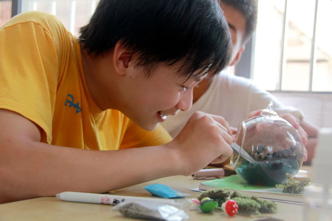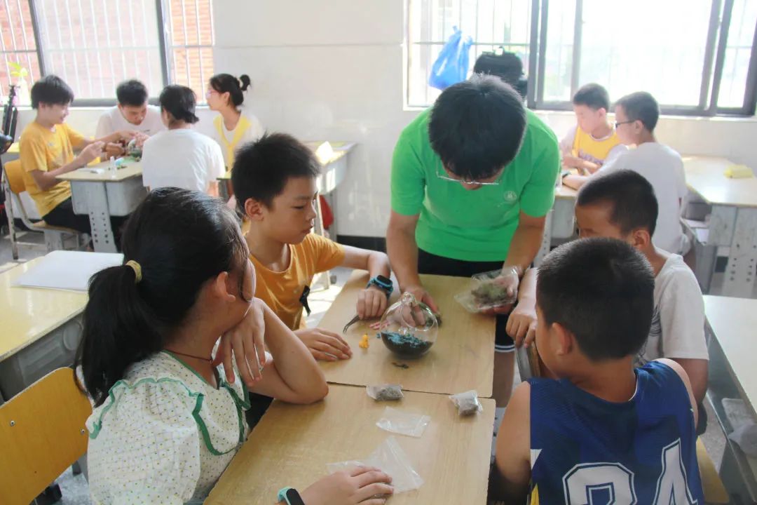 支教团队的指导下,孩子们将泥土、水藻、雨花石等道具依次放入事先准备好的玻璃瓶中。