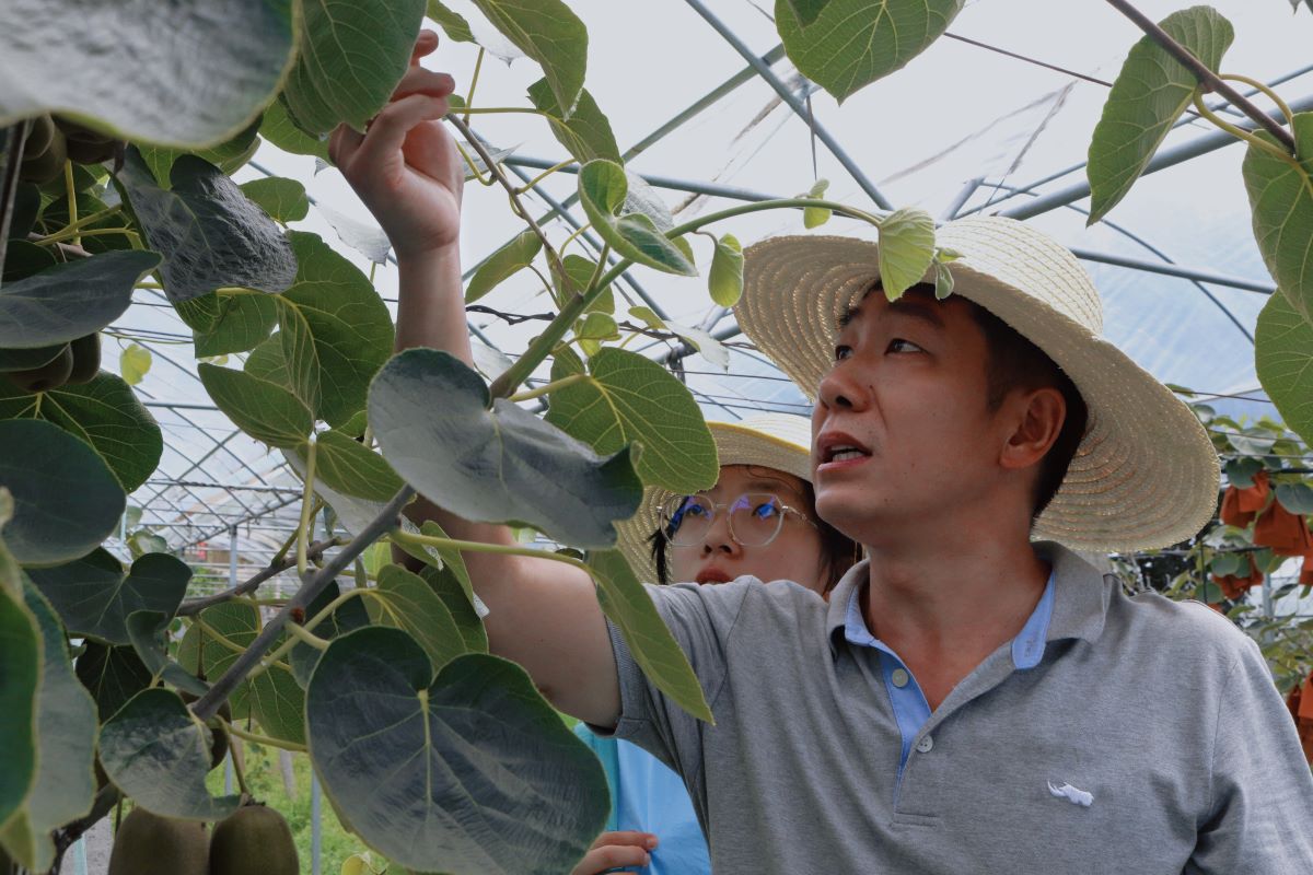 杜仁强向实践团成员展示猕猴桃生长情况 (通讯员 严李思远 摄)