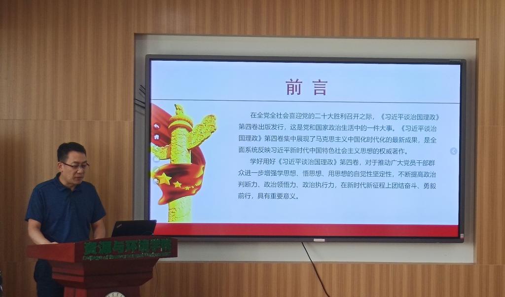 《习近平谈治国理政》第四卷集中展现了马克思主义中国化时代化的最新成果,是全面系统反映习近平新时代中国特色社会主义思想的权威著作。结合“坚持人与自然和谐共生”章节内容,吕守华从深刻理解和把握习近平生态文明思想的科学体系、基本内容、实践要求等三个方面进行了领学。结合学院工作,他谈到,习近平生态文明思想基于历史、立足当下、面向全球、着眼未来,我们要从完善人才培养方案、调整专业结构、加强科研组织、推动绿色转型等四个方面坚定不移用习近平生态文明思想武装头脑、指导实践、推动学院工作。