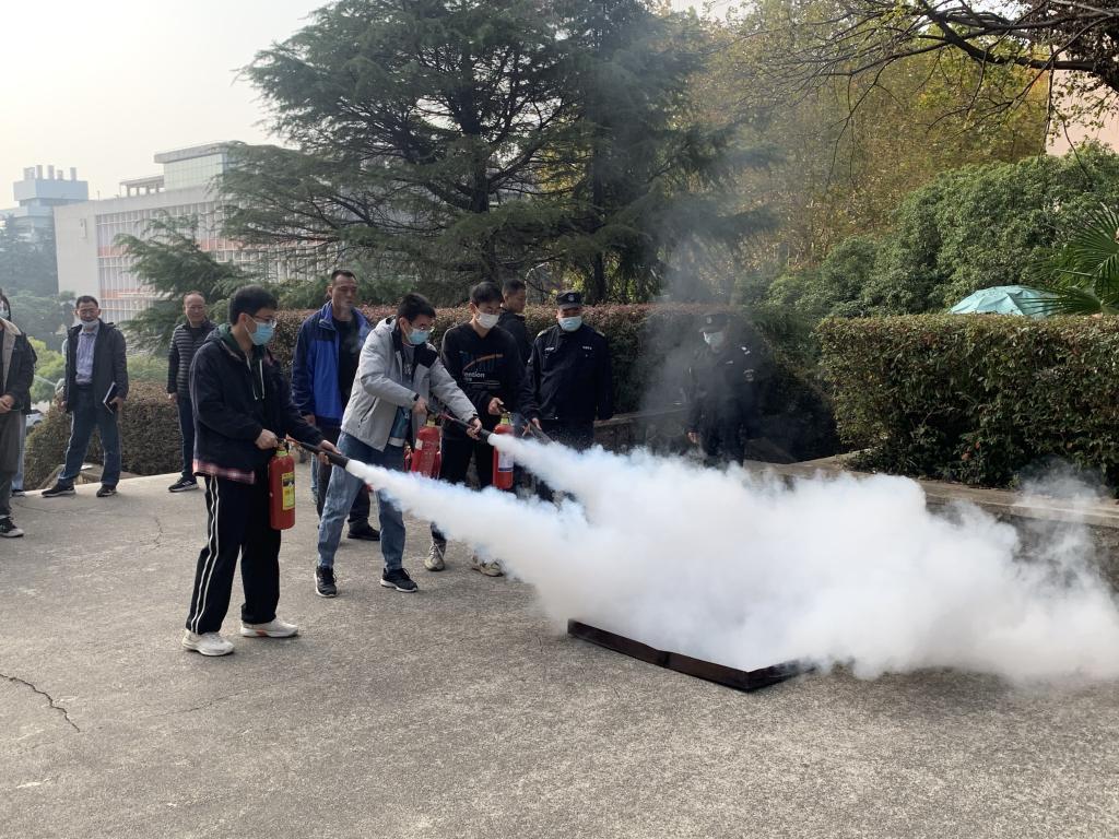 随后,与会同学在主楼台阶参加了火情处置消防演练,现场参加灭火器使用培训和实操演练。