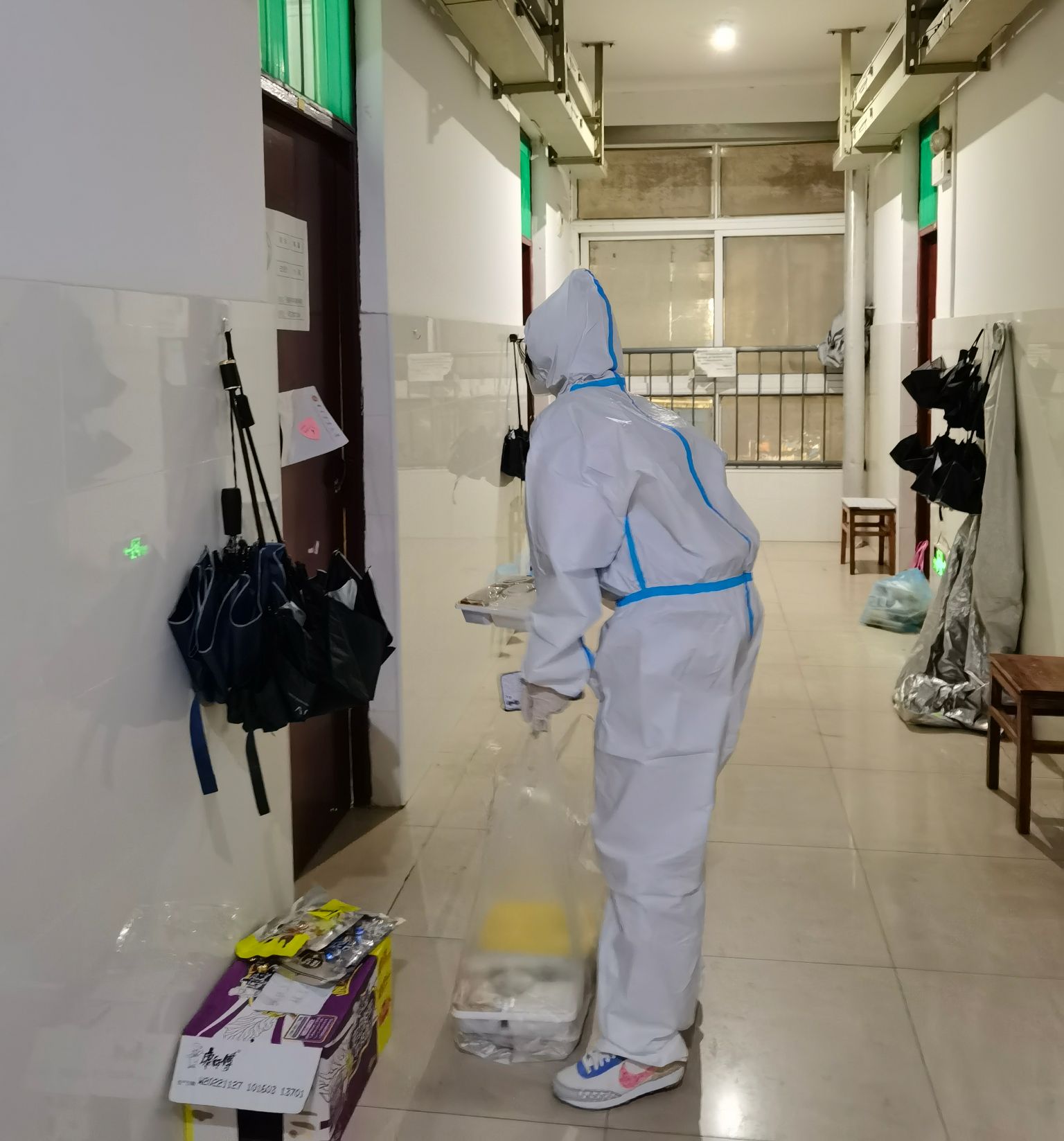 “当我送完最后一份隔离餐时,一回头,便遇见了武汉的初雪。”学生志愿者骆静谊最先加入楼栋志愿者群,“早晨七点,楼长便在博六志愿者群里喊各位志愿者下楼取早餐,回到各自楼层进行派发。我匆匆裹上羽绒服,到楼下提着两大袋热乎乎的早点又回到了五楼发放给同学们。”环工类2201班丁乙负责荟园四栋静默宿舍的餐食发饭和垃圾清理,“这次志愿经历我收获了很多:奉献、勇敢、坚强、挑战……穿上防护服的那一刻我体会到了无数战疫人员的艰辛,我们总被一群勇敢的人保护得很好,我们也要学着他们的样子努力成为一群勇敢的人。”环工类2206班的谢依莎在搬运成袋生活垃圾下楼后,已经汗流浃背,“累,是必然的,但当我每次看到同学们寝室门口贴着的‘感谢’,还有他们那幸福的眼神,我就觉得我所做的事情非常有意义。”志愿者们一张张洋溢着青春气息的脸庞被包裹在防护服之中,刚成年的他们,一手提着一袋装得满满的热饭,就变成了大人的模样。