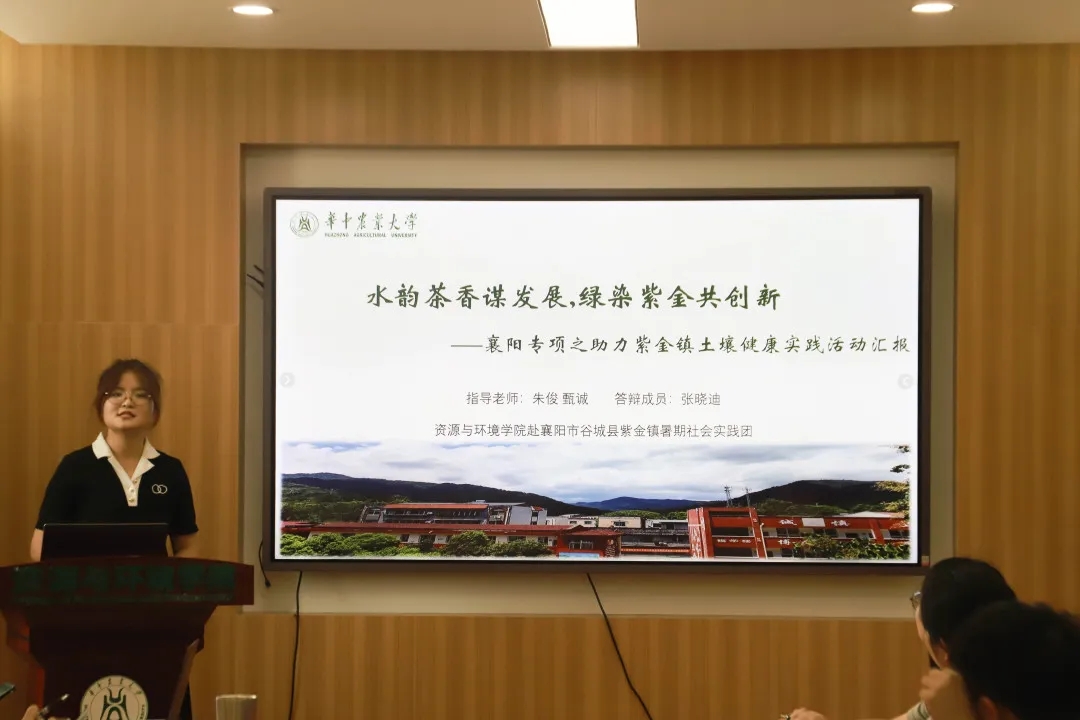 水韵茶香谋发展,绿染紫金共创新。赴襄阳市谷城县紫金镇暑期社会实践团对茶叶种植地进行实验室分析,采取走访、问卷调查、公益宣讲等方式助力乡村生态振兴,聚焦农产品安全,响应全国三普,共筑生态文明乡村。团队在实践过程中秉承这以下三点:学以致用,将知识写在大地上;凝聚团队个性力量,构建多元课程体系;不忘初心,探寻在路上。在团队致谢后,答辩成员张晓迪表达着对乡村未来的美好期望:“田畴迎丰收,乡村新气象,希望的田野铺展乡村振兴壮美画卷。”