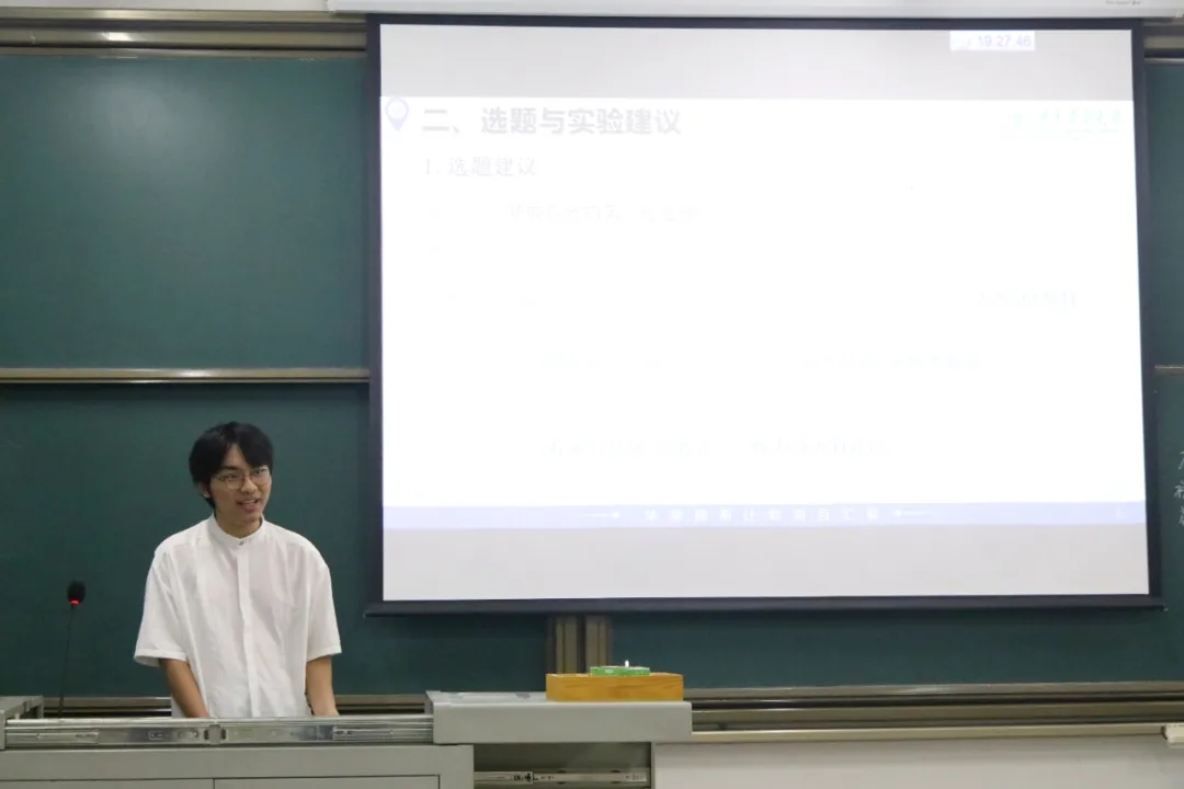 第六届“华癸计划”班长许涛则结合自身经验给同学们分享了许多“干货”。在说到选题建议时,他认为不仅要考虑指导老师擅长领域及其已有项目,还要抓住当前热点话题,选择创新性强、实操性高的题材;对于实验建议,他强调了书写实验记录本的原则——时时记录、真实为先、事事回应。考核时,答辩ppt的制作与汇报是尤为重要的,详略得当的内容是基础,ppt中加入简单的动画更能吸引老师的注意力。反复演练,灵活控制时长,汇报时保持微笑、大方得体,这些都是需要注意的细节。