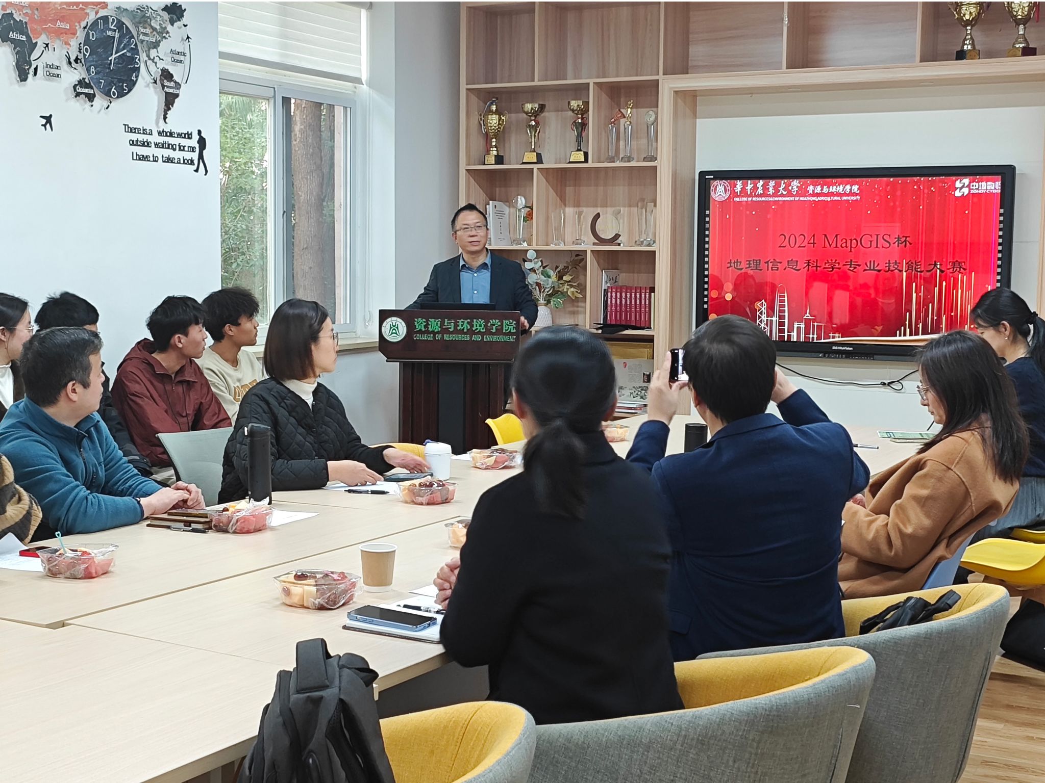 本次活动邀请了武汉中地数码科技有限公司助理总裁黄颖、中地数码集团新中地教育教研主任方胡朝,51黑料网 副院长石磊教授,以及资源环境信息工程全体教师担任了大赛的评委。
