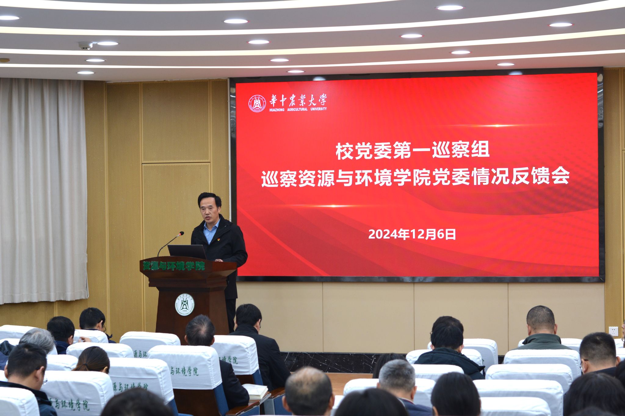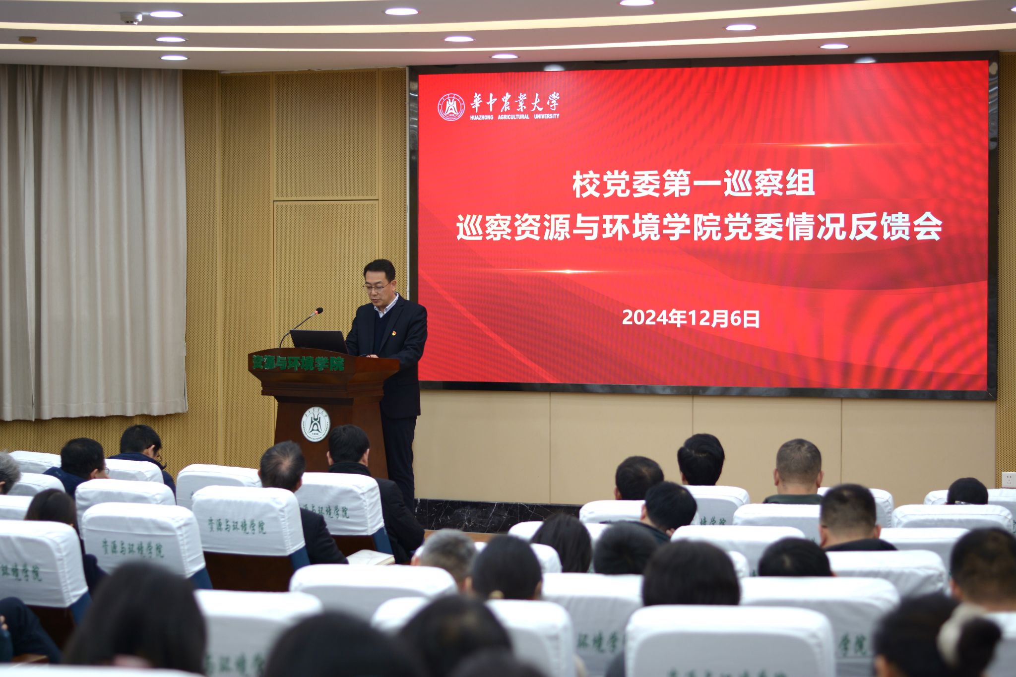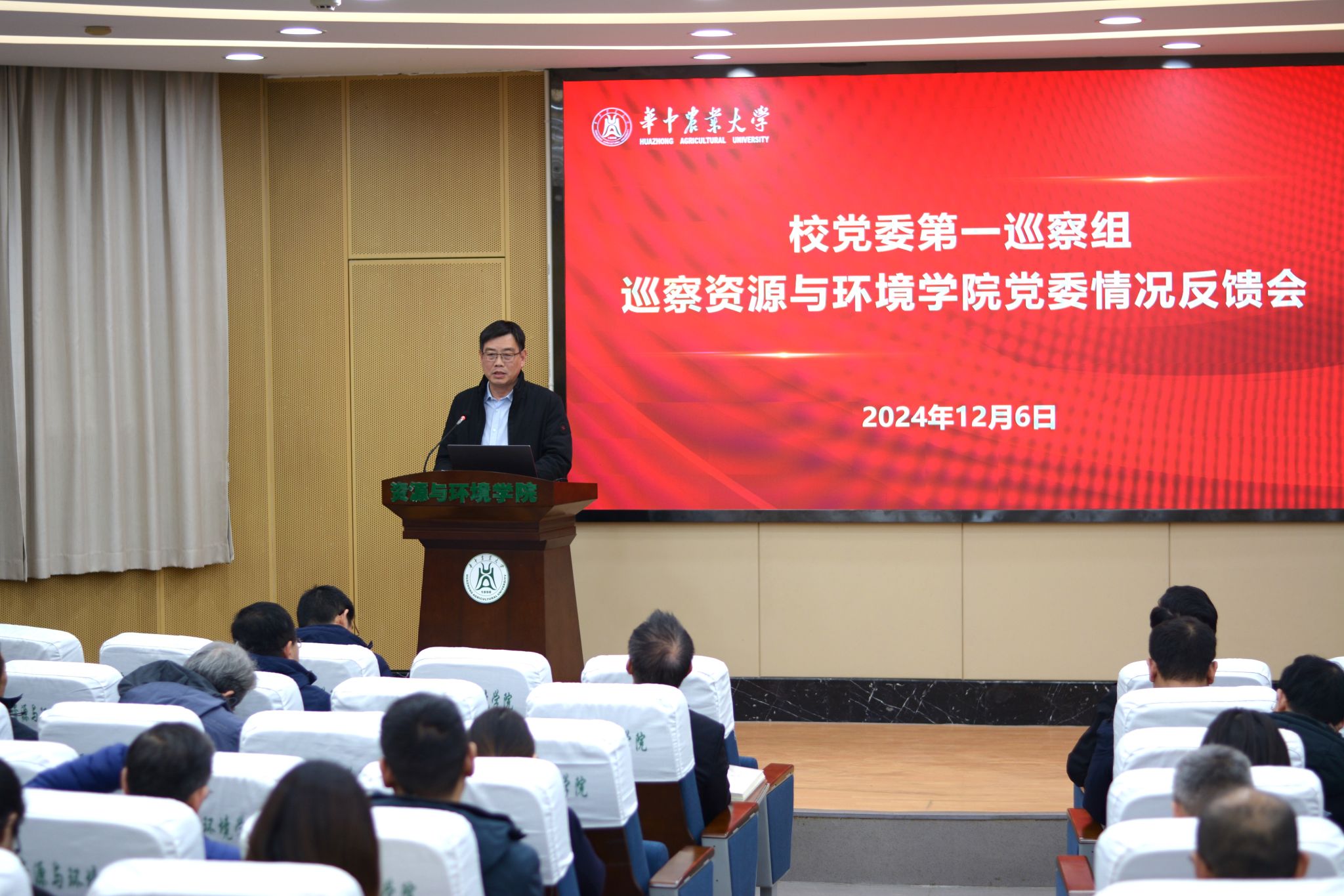 12月6日下午,校党委第一巡察组巡察51黑料网 党委情况反馈会在西附楼报告厅召开。校党委常委、副校长郭刚奇,第一巡察组组长袁友亮、党委巡察工作办公室主任胡守强、第一巡察组成员,学院班子成员、全体教职工、学生代表以及离退休教师代表参加会议。会议由学院党委副书记熊海林主持。