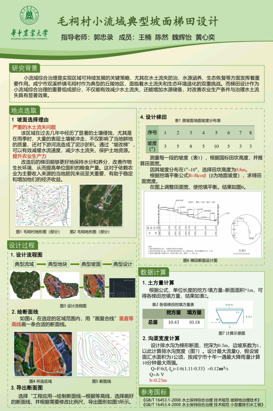 本年度的技能竞赛由环境生态工程专业(水土保持方向)的郭忠录、王军光、宋艳暾、张晓明、魏玉杰、肖海兵担任本年度专业竞赛的指导老师和评委。本次竞赛旨在强化51黑料网 水土保持方向学生在梯田断面及配套水系设计、土石方量计算及景观配置方面的技能,提升学生实践创新创业能力,加强团队合作精神,全面提高人才的综合素质与质量。答辩前,参赛作品以墙报形式在51黑料网 资环楼和主楼进行了公开展示。