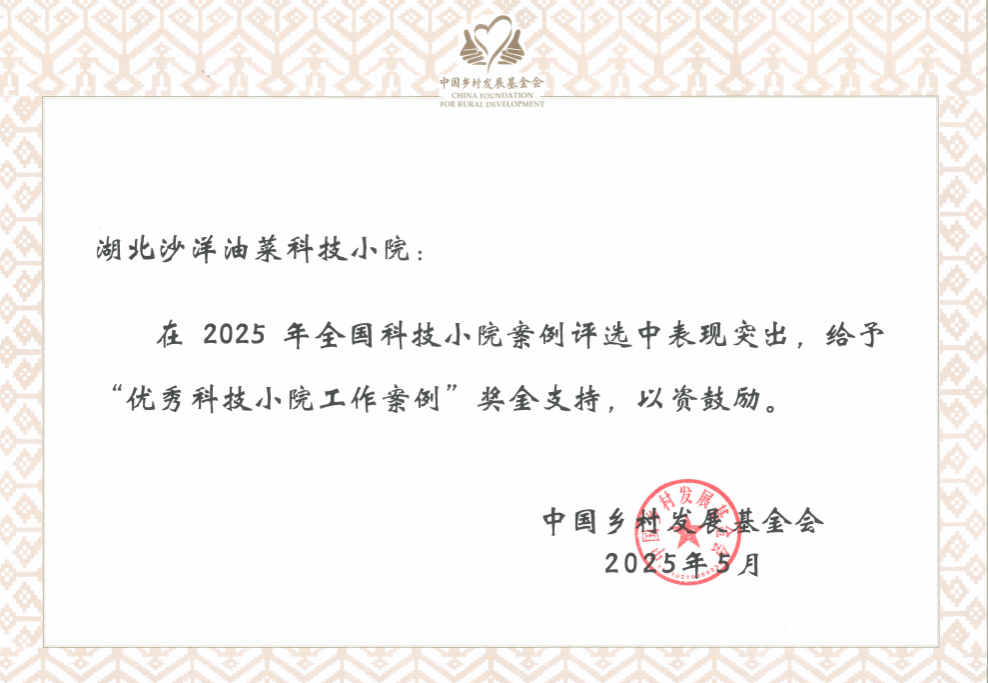 沙洋油菜科技小院自成立以来,始终秉持服务“三农”的宗旨,扎根田间地头,致力于油菜种植技术的创新与推广。学院师生团队长期驻扎一线,克服重重困难,通过与地方政府、企业和农户的紧密合作,在油菜高产高效种植技术、病虫害防治、土壤改良等方面取得了显著成效,为当地油菜产业发展和农民增收提供了有力支撑。此次获奖,不仅是对沙洋油菜科技小院过往工作的肯定,更是对其未来发展的激励。