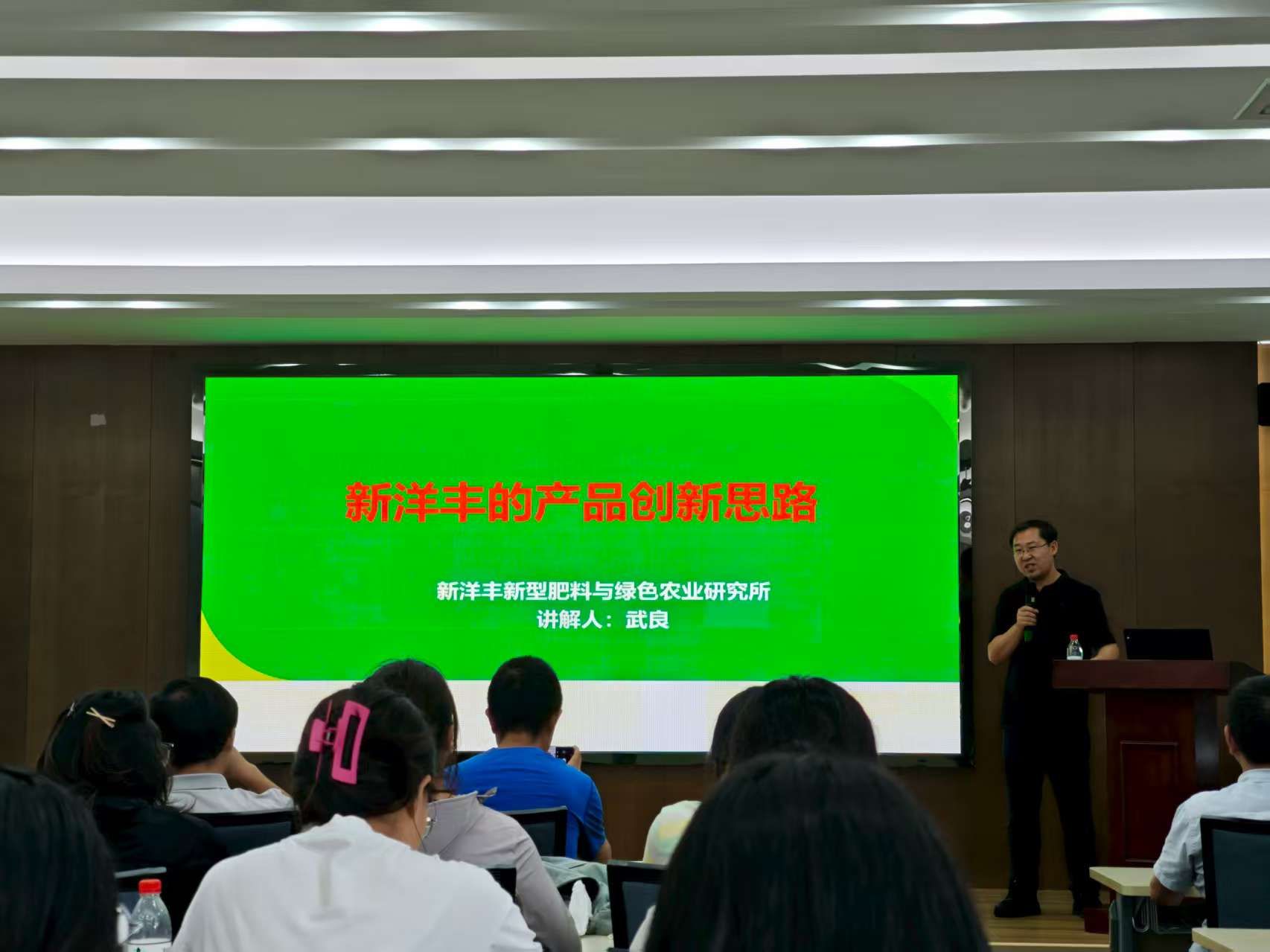 7月6日上午,全体成员走进新洋丰子陵试验基地。从精细化管理的盆栽试验区,到对比分明的小区试验田,再到规模化的大田试验区,学生们实地观摩不同作物的肥料效应试验、新型技术应用场景,切身感受农业科研中“从实验室到田间”的严谨逻辑与创新思维。基地负责人介绍,该试验田年均开展超百项肥料与栽培技术研究,为企业产品迭代提供核心数据支撑。 参观结束后,新洋丰新型肥料研究所武良所长在培训中心301室带来“产品创新思路”专题分享。他以“减肥增效”“绿色农业”等行业趋势为切入点,解析企业如何通过土壤检测、作物需肥规律研究驱动产品升级,展现科技赋能农业的实践路径。当日下午,首席农艺师邓超以“农业服务团队打造”为主题,通过农户服务案例剖析,揭示现代农业中技术推广与服务体系的构建逻辑,让学生深刻理解“把论文写在大地上”的责任与价值。