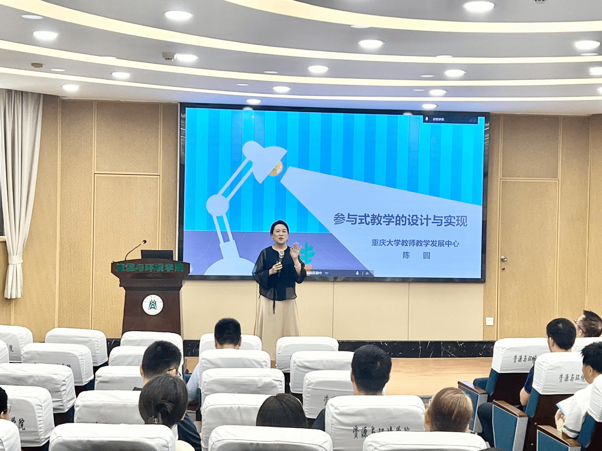 首场专题讲座特邀重庆大学教师教学发展中心陈圆主任主讲。作为国家智慧教育公共服务平台课程主讲人,她以“课堂参与的三重境界”为框架,阐释参与式教学核心理念:留白提供认知加工时间,提问激活深度思维,主动学习促进知识建构。她强调,参与式教学本质是“让学生思考”,需通过小组讨论、案例分析等目标导向活动提升知识留存率,并聚焦“课程重难点转化为参与式活动”开展实操指导。最后,她鼓励老师们充分运用DeepSeek等辅助设计不同难度层次的问题,充分利用AI技术提高备课效率和课堂效果。