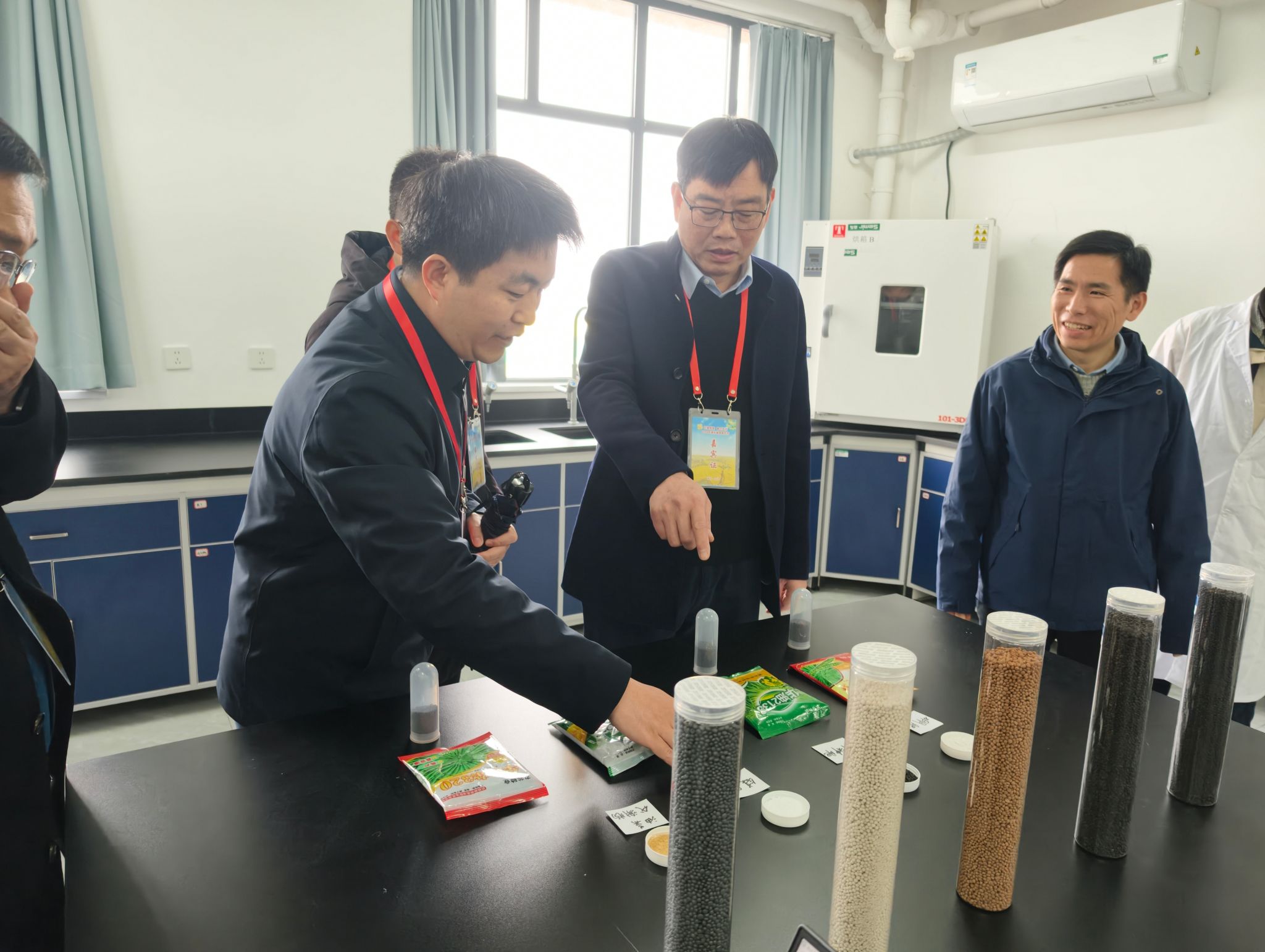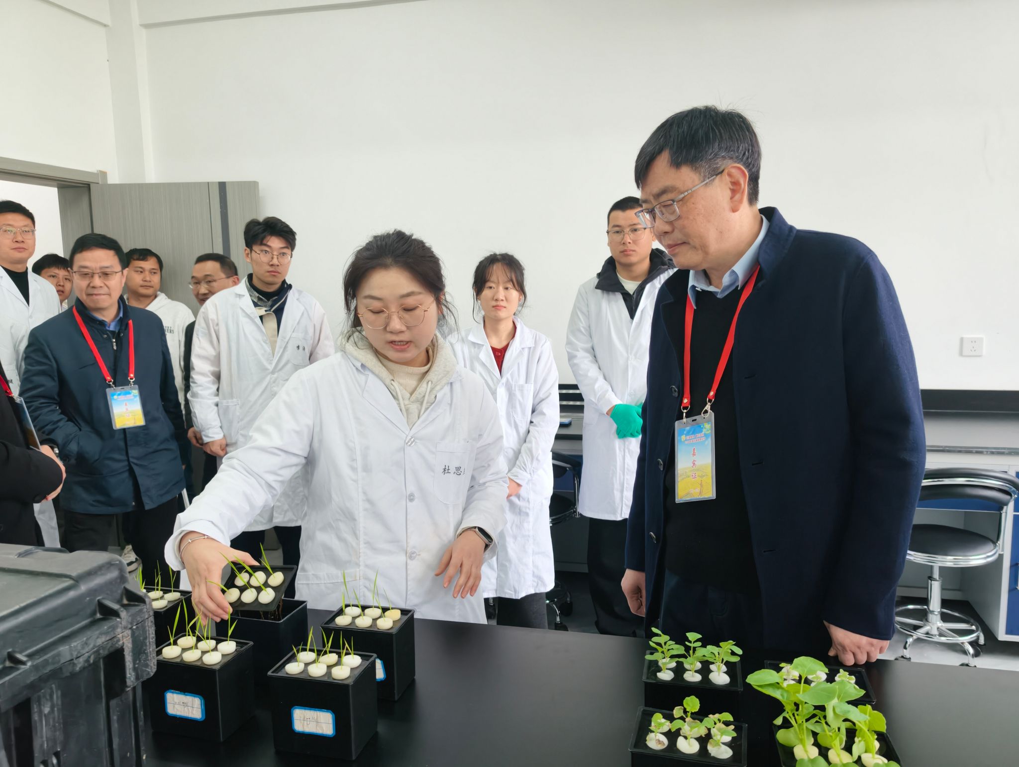 在成果展示区,郭刚奇副校长一行察看了自主研发的油菜拌种肥、稻田土壤还原性物质消减剂、作物专用缓控释肥等科研物化产品及培肥土壤科学施肥技术成果。在实验室,研究生代表向专家和领导们汇报了研究进展,郭刚奇副校长就科研方向凝练、成果落地转化及复合型人才培养等方面提出了具体指导意见。