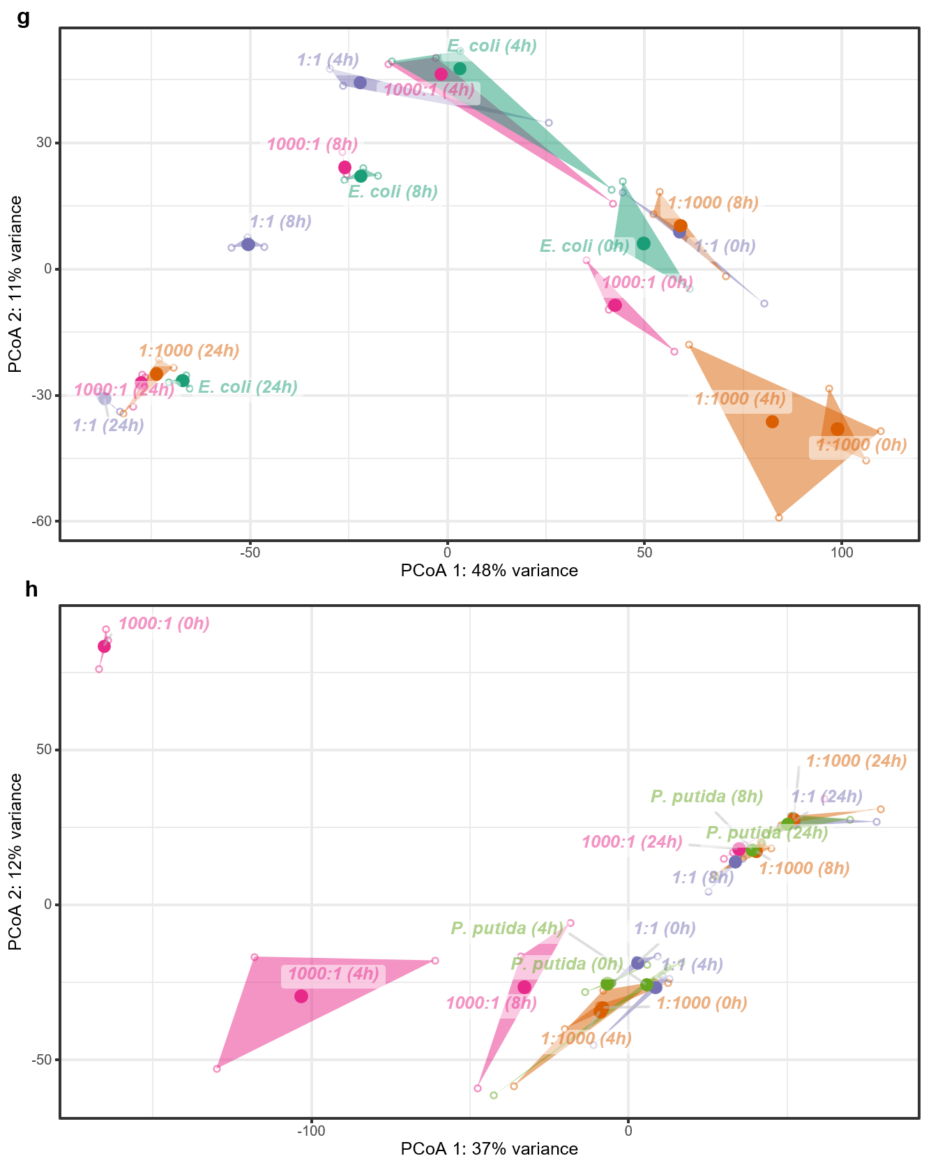 本研究发现,在由两个模式生物膜细菌(大肠杆菌E. coli和恶臭假单胞菌P. putida)按照一定比例构建的多个合成菌群中,尽管其初始结构指标相差 100 万倍,但是在 24 h 内各个菌群在群落结构和基因表达变化两个方面即可完成收敛,并且收敛过程主要是由细菌内在的适应性所驱动。此外,菌群的群落结构在初期变化相对较小,而基因表达的变化则非常显著,具有明显的 “涌现性” 特征。