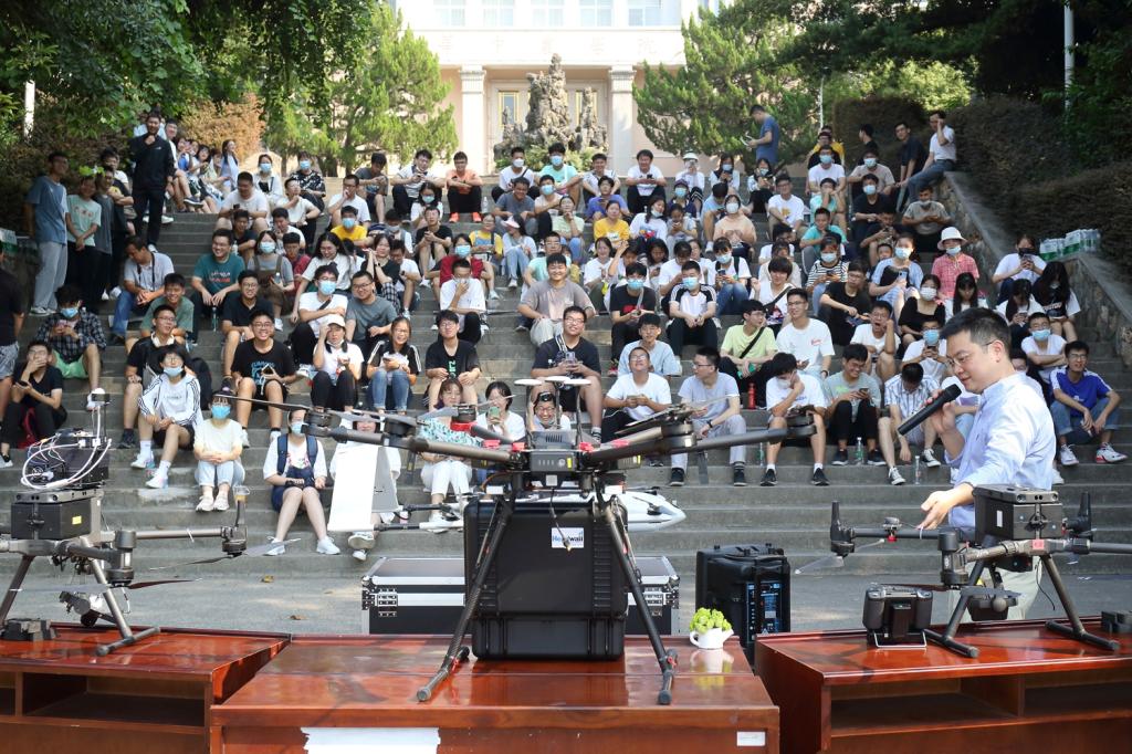 今天的主楼台阶,依然活跃着一群青年,他们席地而坐,或认真聆听、或举目张望,他们正在参加“狮山极目•无人机操作示范活动”,领略无人机操作风采。