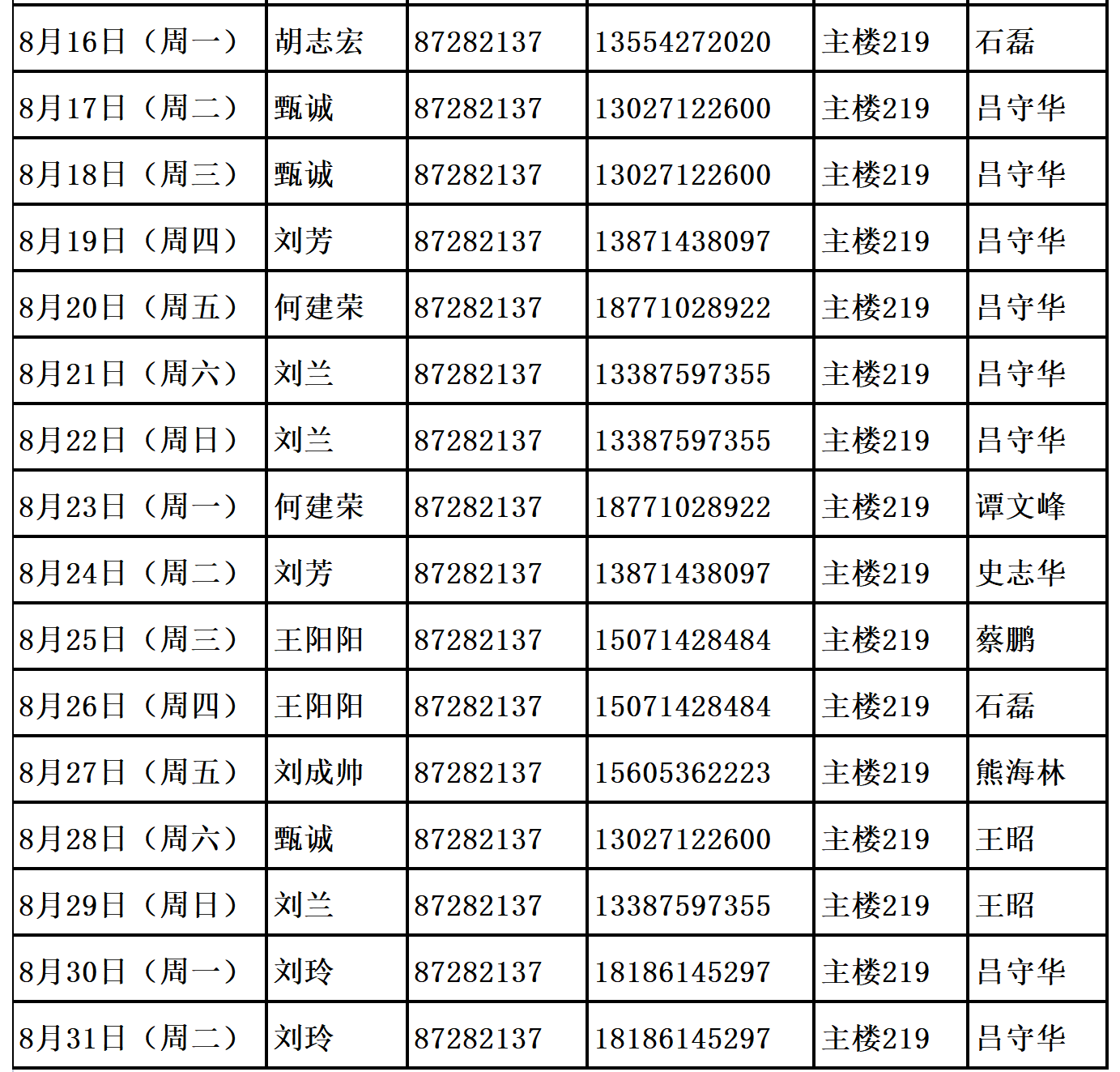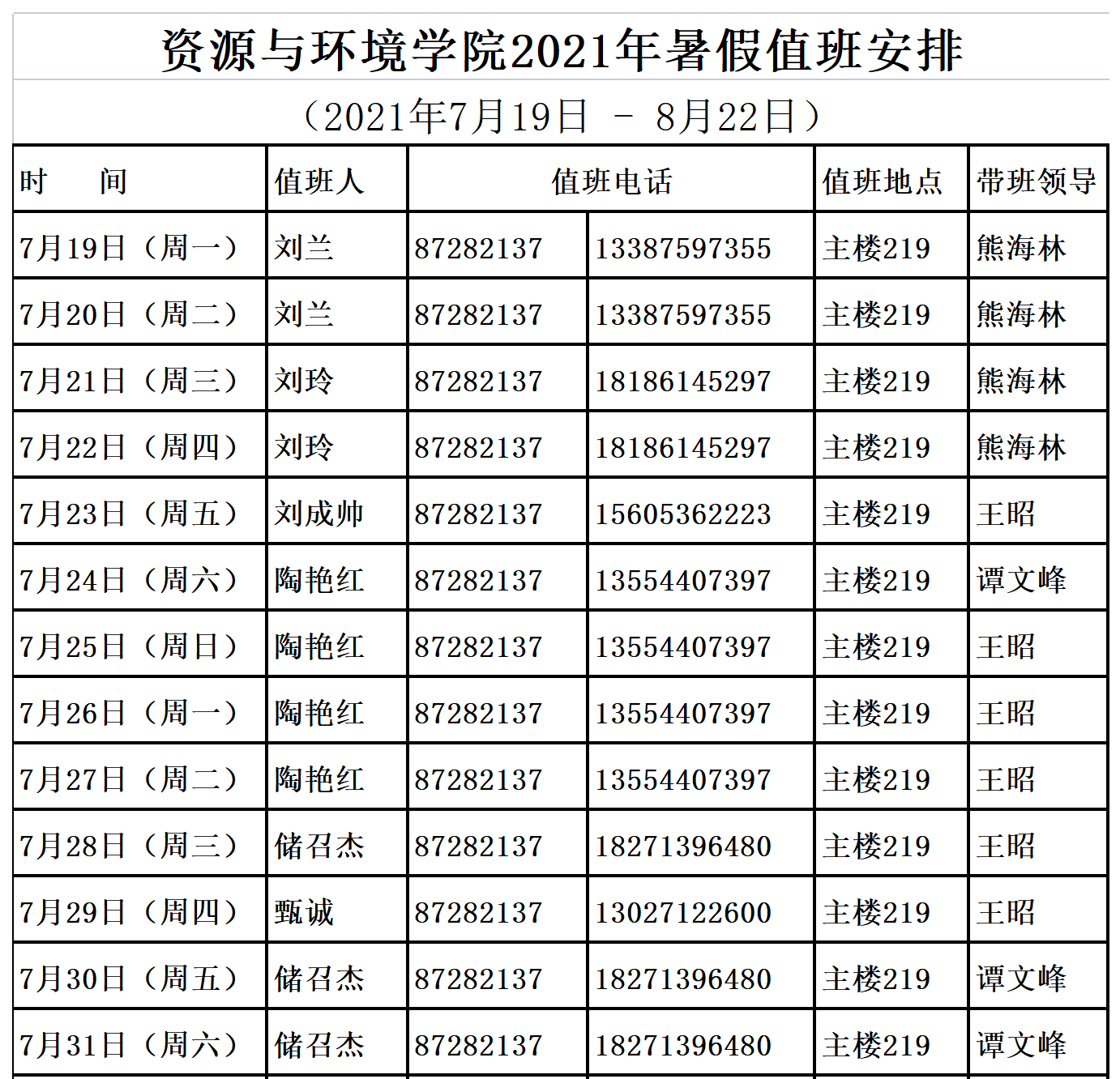 1.值班时间为上午8:30-11:30,下午3:00-5:30。 2.带班领导值班应当在武汉市,值班人员需在主楼219办公室值班值守,主楼219的钥匙在126房间领取,用完后归还。 3.值班人员要严格落实值班工作岗位责任制,加强安全巡察和隐患排查。如遇紧急情况和突发事件,要立即反应、及时报告、迅速调度、及时反馈。