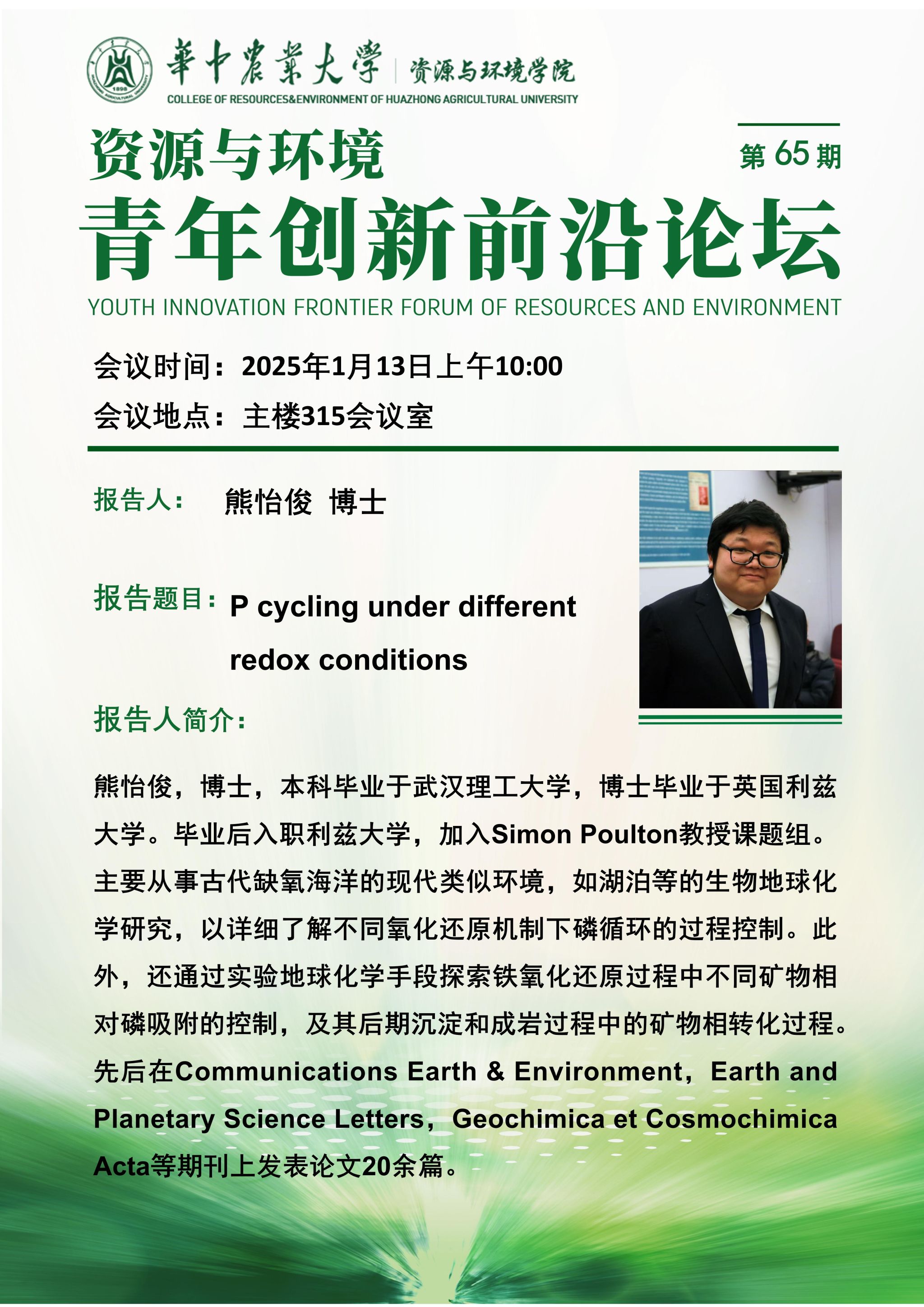 【青年创新前沿论坛】第65期:P cycling under different redox conditions