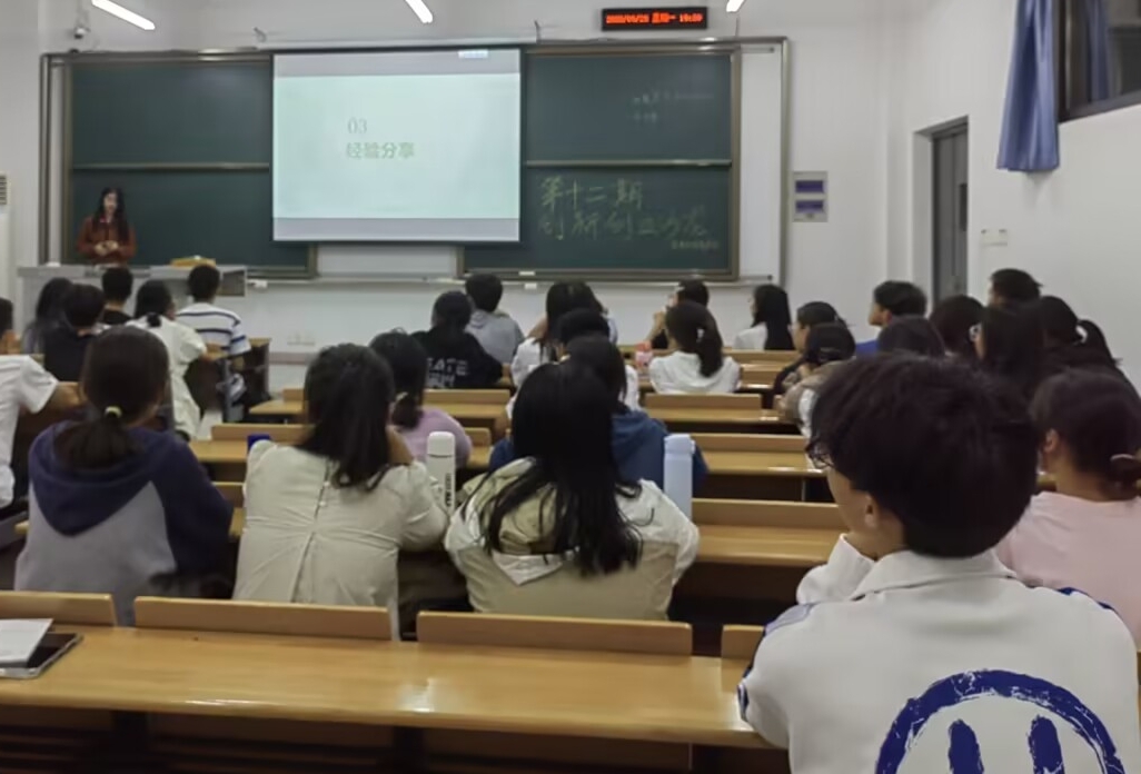 而周楠宇则是以51黑料网 获奖项目为例,向同学们介绍了两大创新创业类竞赛——中国“互联网+”创新创业大赛和“挑战杯”全国大学生系列科技学术比赛,她指出,不管从专业角度,认可度等其他方面考虑,这两大创新创业类竞赛都值得同学们在大学阶段努力尝试。