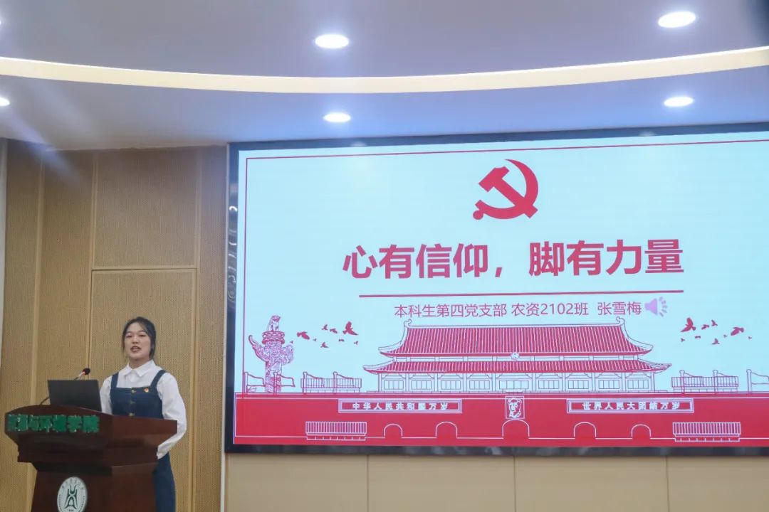 “如果信仰有颜色,那一定是中国红。”本科生第四党支部张雪梅以“心有信仰,脚有力量”为题进行分享,在悠扬舒展的背景音乐中,关于对信仰的理解,她饱含深情娓娓道来。对共产主义的信仰,对中国特色社会主义的信念,是共产党人的政治灵魂,是共产党人经受住任何考验的精神支柱,张雪梅讲到:“坚定理想信念,必先知之而后信之,信之而后行之。”本科生第二党支部张骏辉则以“红旗指引前进方向”为题讲述了云南革命的故事,重重磨难中,共产党人表现出的坚定信念令人肃然起敬。他结合自己在学校国旗护卫队的经历,真诚地说道:“我们要把对党的忠诚践行到实践行动中。”