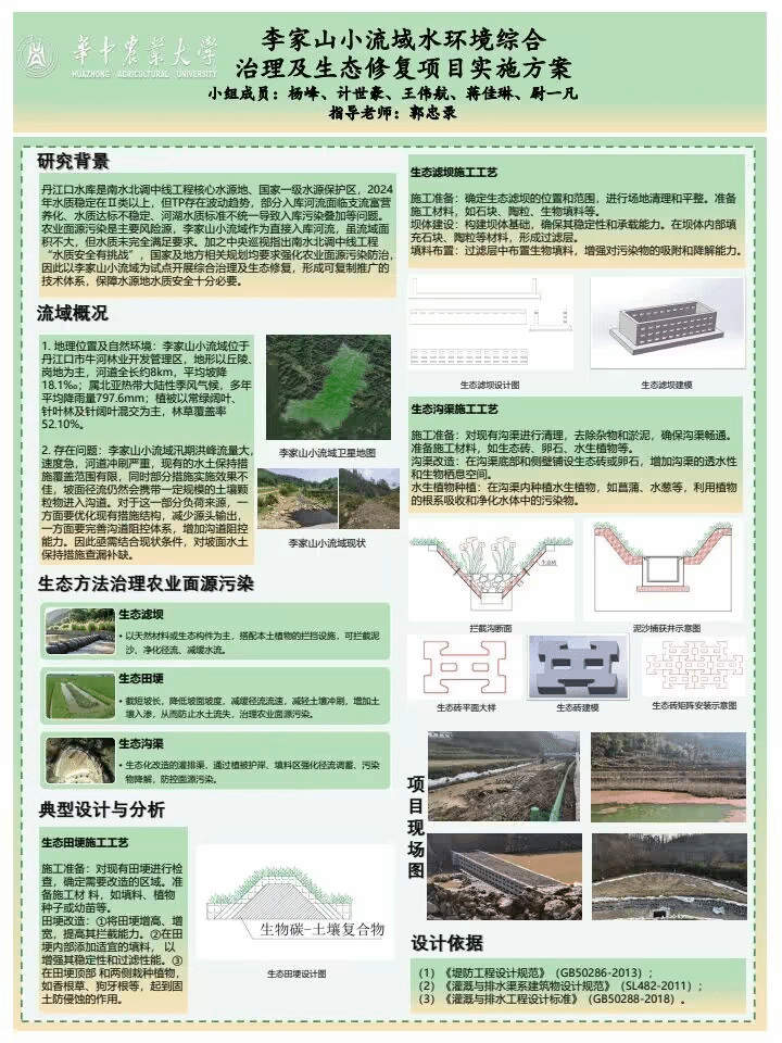 随后,参赛队伍按抽签顺序依次进行作品展示与答辩。“降雨驱动下流域硝酸盐来源及输出机制”团队聚焦丹江口库区农业流域,分析不同降雨事件下硝酸盐来源与输出机制。结果表明粪肥污水为主要来源,水文及前期条件影响其输出滞后模式;“李家山小流域水环境综合治理及生态修复项目实施方案“该团队设计了生态田埂、生态沟以及生态滤坝三类水土保持工程措施,从农业种植、居民生活、河道治理三个方面减少流域水土流失;“王家冲生态清洁小流域“项目以“源-流-汇”系统为核心,通过控污、净化、生金三步走,实现清水下山、幸福进村,兼顾生态治理与村民参与;“丹江口生态小流域设计“针对丹江口市环境生态问题,提出小流域建设方案,聚集“保土,净水,控污,兴村”四个目标,通过源头防控,过程拦截,末端治理三步走,融合生态修复、污染治理与绿色发展,实现生态保护、水质安全与乡村振兴的有机统一, 构建可持续的小流域生态系统;“基于功能差异的生态保育型与人居环境型小流域水土保持措施配置对比与优化研究”以北京市六渡河与亮马河小流域为例,对比分析两类小流域治理的共性与特性,为差异化治理提供参考。比赛中,老师们针对汇报内容提出问题并给出完善建议。