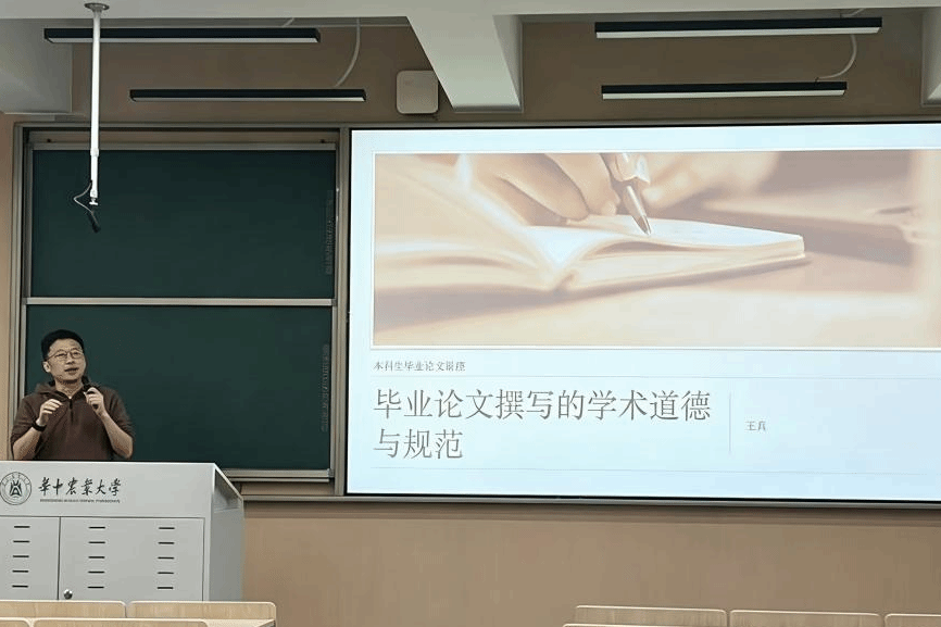 王真老师以学术道德与写作规范为主题展开讲授,结合学术不端典型警示案例,深刻阐释了学术诚信的终身价值与违规行为的严重后果,同时对照学校本科论文撰写规范,明确了从封面到参考文献的全流程格式标准,为学生划定了论文写作的合规红线。